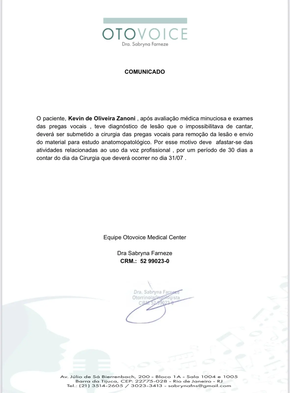 Por esse motivo, o cantor “ deverá afastar-se das atividades relacionadas ao uso da voz profissional, por um período de 30 dias a contar do dia da Cirurgia que deverá ocorrer no dia 31/07”.