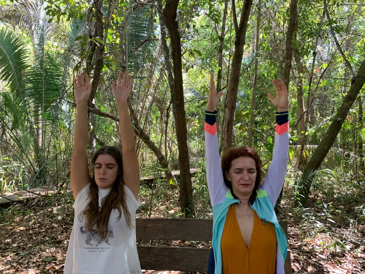Catarina e sua mãe Marlúcia praticando yoga dourada e automassagem