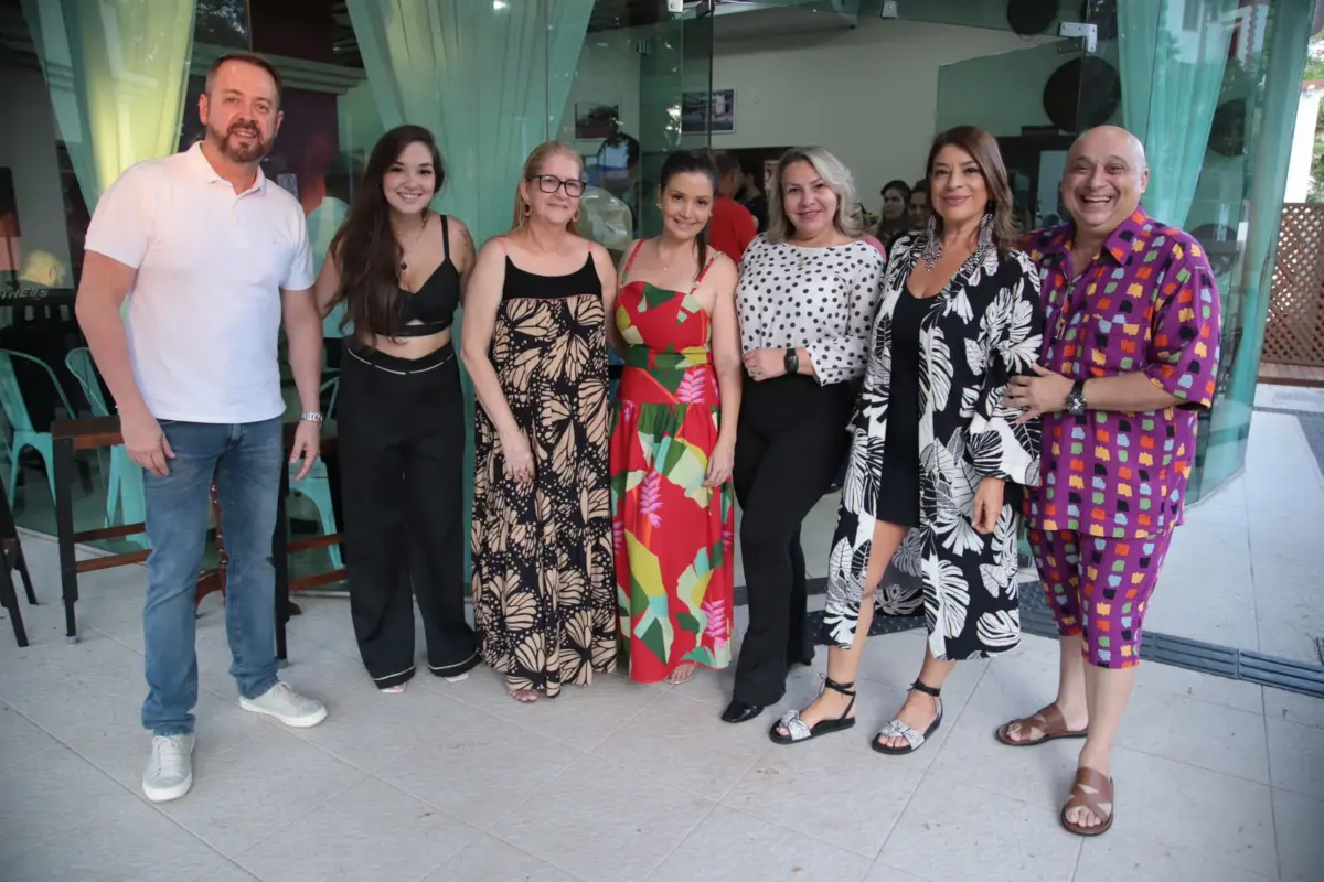 As anfitriãs – Camile, Inês e Claudinha – com os amigos Marcelo Messias, Jackie e Vagno Di Paula