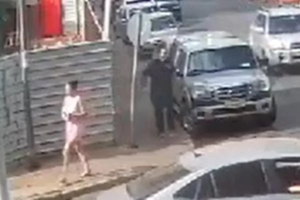 Ela caminhava pela calçada quando uma caminhonete Ford prata apareceu na rua. Na sequência, um homem vestido com camiseta preta e calça jeans desembarcou do carro e se aproximou dela.