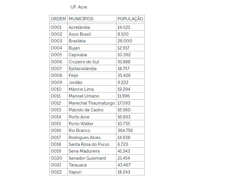 Saiba quantos moradores tem cada município do Acre: