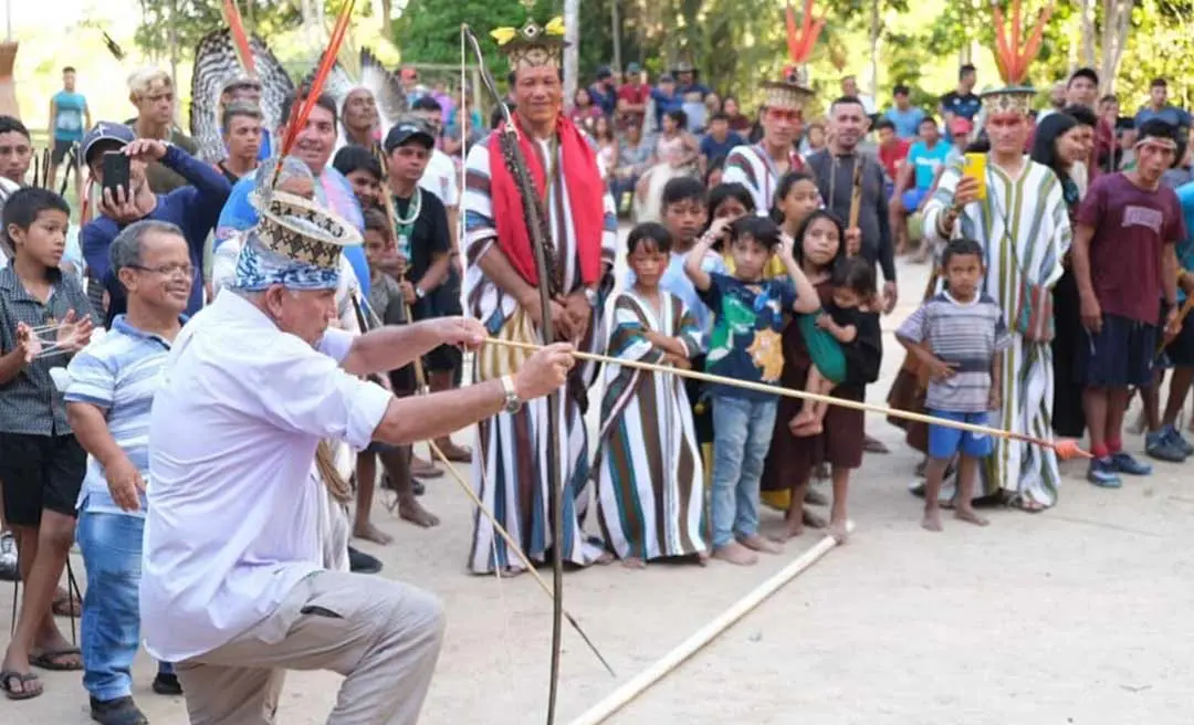 Petecão usando um arco e flecha durante visita na Aldeia Apiwtxa, em Marechal Thaumaturgo, em junho de 2022/Reprodução