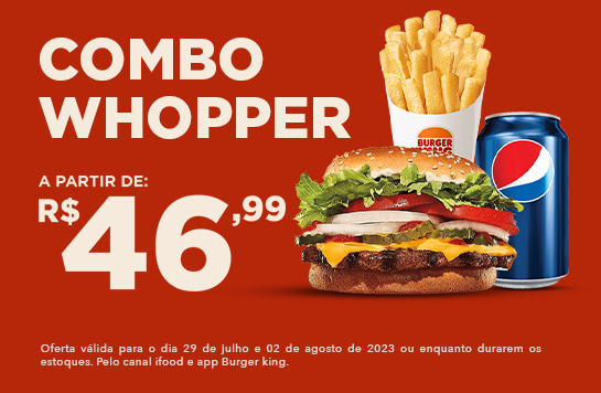 O Burger King oferece mais uma mega oferta: Combo Whopper a partir de R$ 46,99, que inclui sanduíche, batata frita e refrigerante.