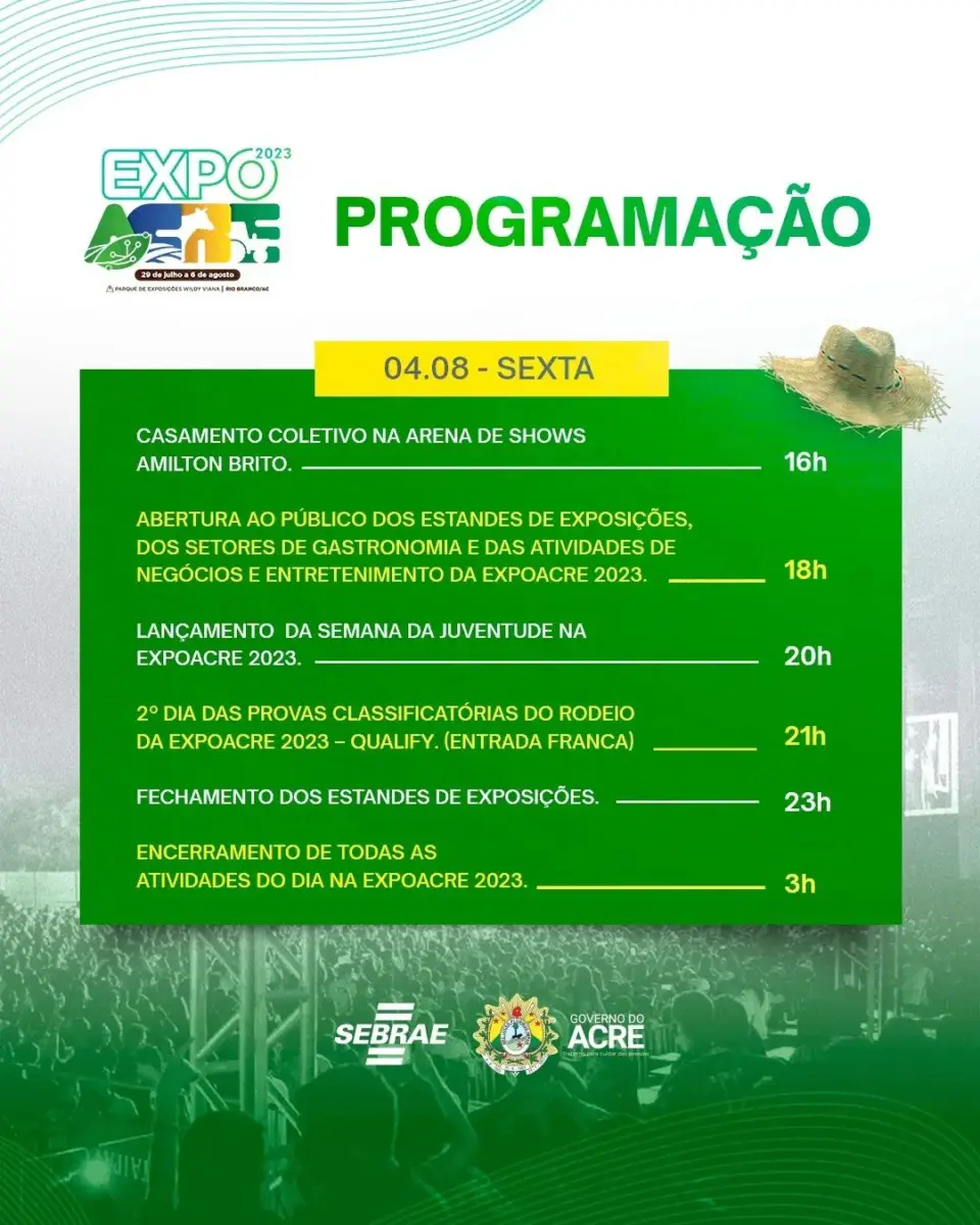Na Expoacre também acontece o Casamento Coletivo, na Arena de Shows Amilton Brito, às 16, e o lançamento da Semana da Juventude, às 20h. A Feira segue ainda com uma vasta programação nos stands institucionais de várias pastas do Governo e de empresas privadas, até às 23h.