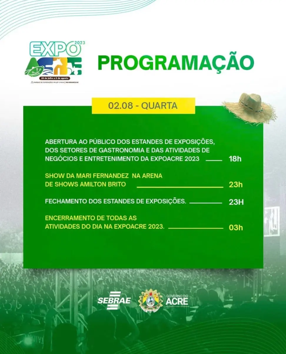 Nesta quarta-feira (2) acontece o quinto dia de Expoacre 2023 e o show gratuito da cantora Mari Fernandez promete lotar o parque de exposições, a partir das 22h. Além da apresentação nacional, a maior feira de negócios do Acre traz outras ações realizadas dentro do parque e continua com os estandes de exposições, dos locais gastronômicos e com atividades de negócios, abertas ao público até às 23h.