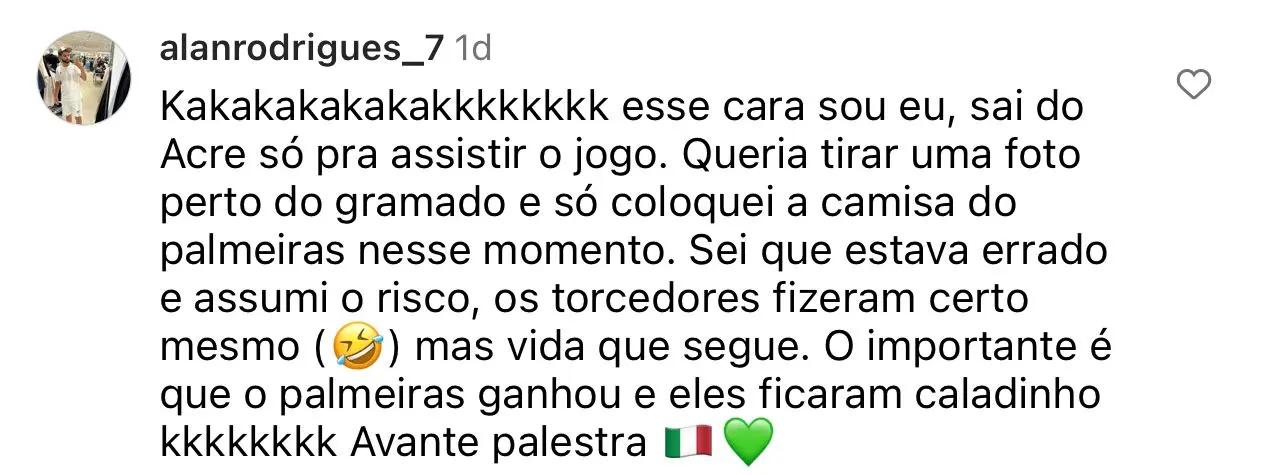 “Queria tirar uma foto perto do gramado e só coloquei a camisa do Palmeiras neste momento. Sei que estava errado e assumi o risco”, disse o acreano.