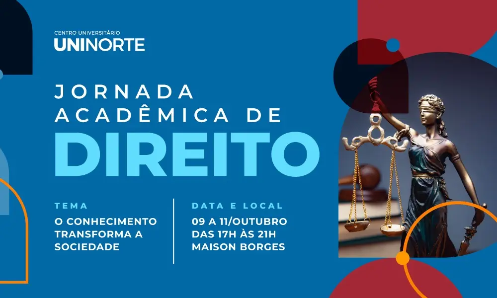 O curso de Direito do Centro Universitário Uninorte realiza, entre os dias 9 e 11 de outubro, a Jornada Acadêmica de Direito. Com o tema “O conhecimento transforma a sociedade”, o evento acontece na Maison Borges, das 19h às 21h, e contará com uma programação diversificada e com diversos especialistas.