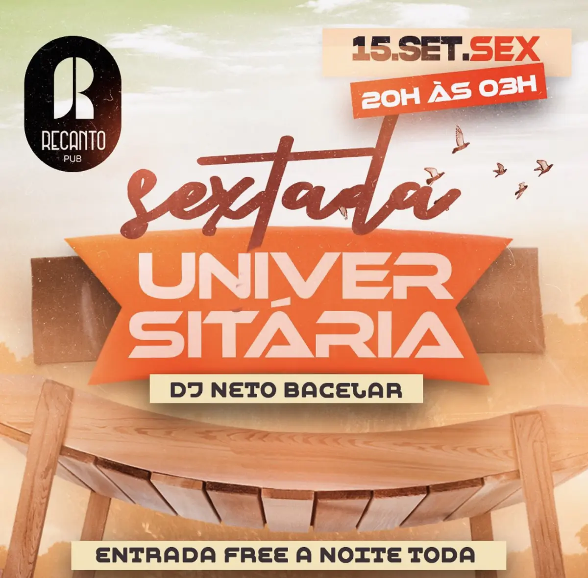 Nesta sexta-feira (15), das 20h às 03h, acontece a Sextada Universitária, com DJ Neto Bacelar. A entrada é livre a noite inteira no Recanto Pub.