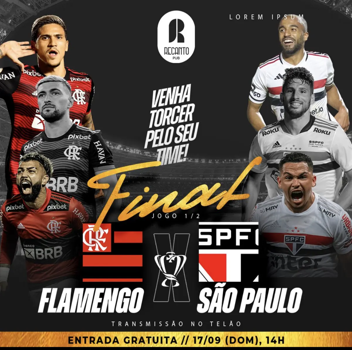 No Recanto Pub, neste domingo (17), acontece a transmissão da final da Copa do Brasil, entre Flamengo e São Paulo, com entrada gratuita.