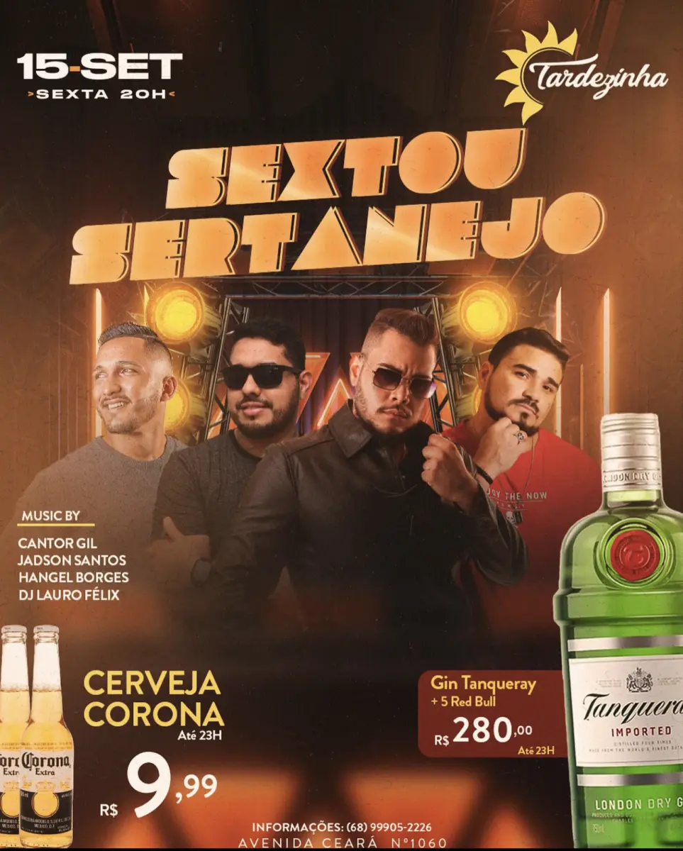 Nesta sexta-feira (15), às 20h, acontece o Sextou Sertanejo, com Cantor Gill, Jadson Santos, Hangel Borges e DJ Lauro Félix.