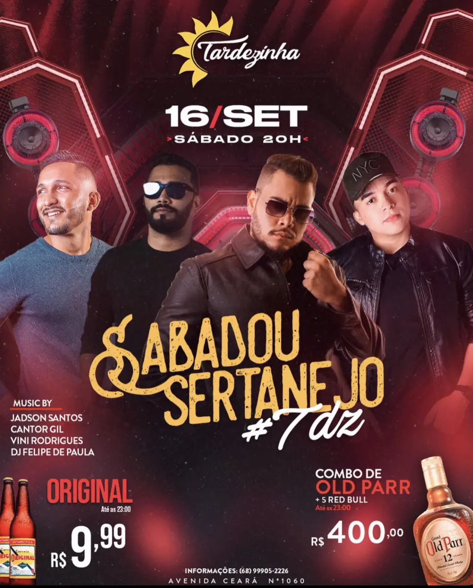 Neste sábado (16), às 20h, o Sabadou Sertanejo acontece no Tardezinha com Jadson Santos, Cantor Gill, Vini Rodrigues e DJ Felipe de Paula.