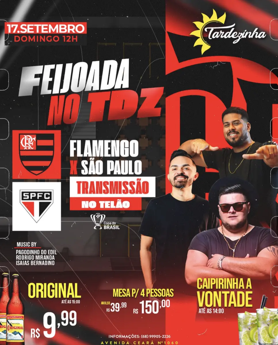 No Tardezinha, neste domingo (17), às 12h, acontece a Feijoada no TDZ, com a final da Copa do Brasil, com Flamengo x São Paulo. Os ingressos custam R$ 39,90 avulso e a mesa para pessoas, custando R$ 150,00.