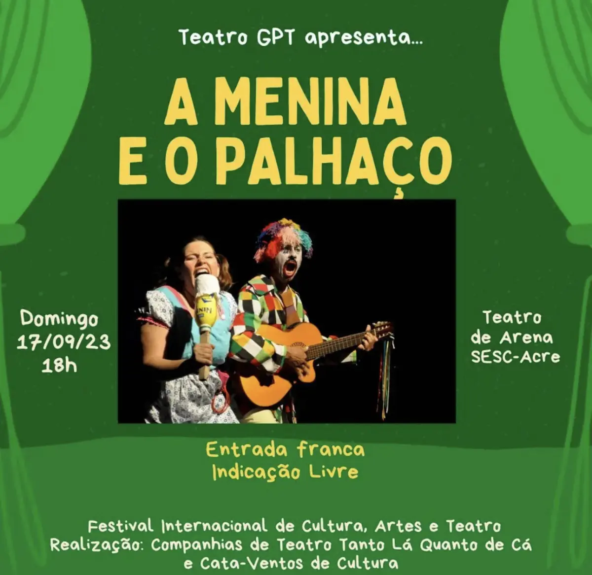 Outra apresentação artística é com o Teatro GPT, que apresenta A Menina e o Palhaço, no domingo (17), às 18h, no Teatro de Arena do Sesc, com entrada livre.