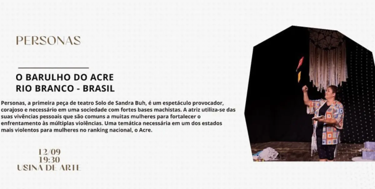 A atriz Sandra Buh apresenta o espetáculo ‘Personas’, neste final de semana, na Usina de Arte. Personas é um teatro solo que propõe uma reflexão sobre as diversas violências sofridas pelas mulheres. Neste espetáculo, a atriz traz de volta algumas de suas personagens mais marcantes para revelar detalhes de suas experiências pessoais que são universais sobre os enfretamentos femininos.