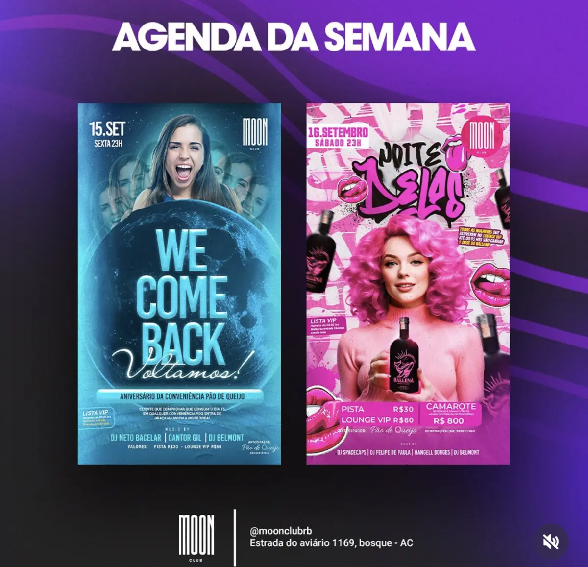 A Moon Club apresenta o aniversário da Conveniência Pão de Queijo, nesta sexta-feira (15), às 23h. No dia 26 de setembro, neste sábado, a partir das 23h, acontece a Noite Delas, com ingresso no valor de R$ 30,00 (pista) e R$ 60,00 (Lounge VIP).