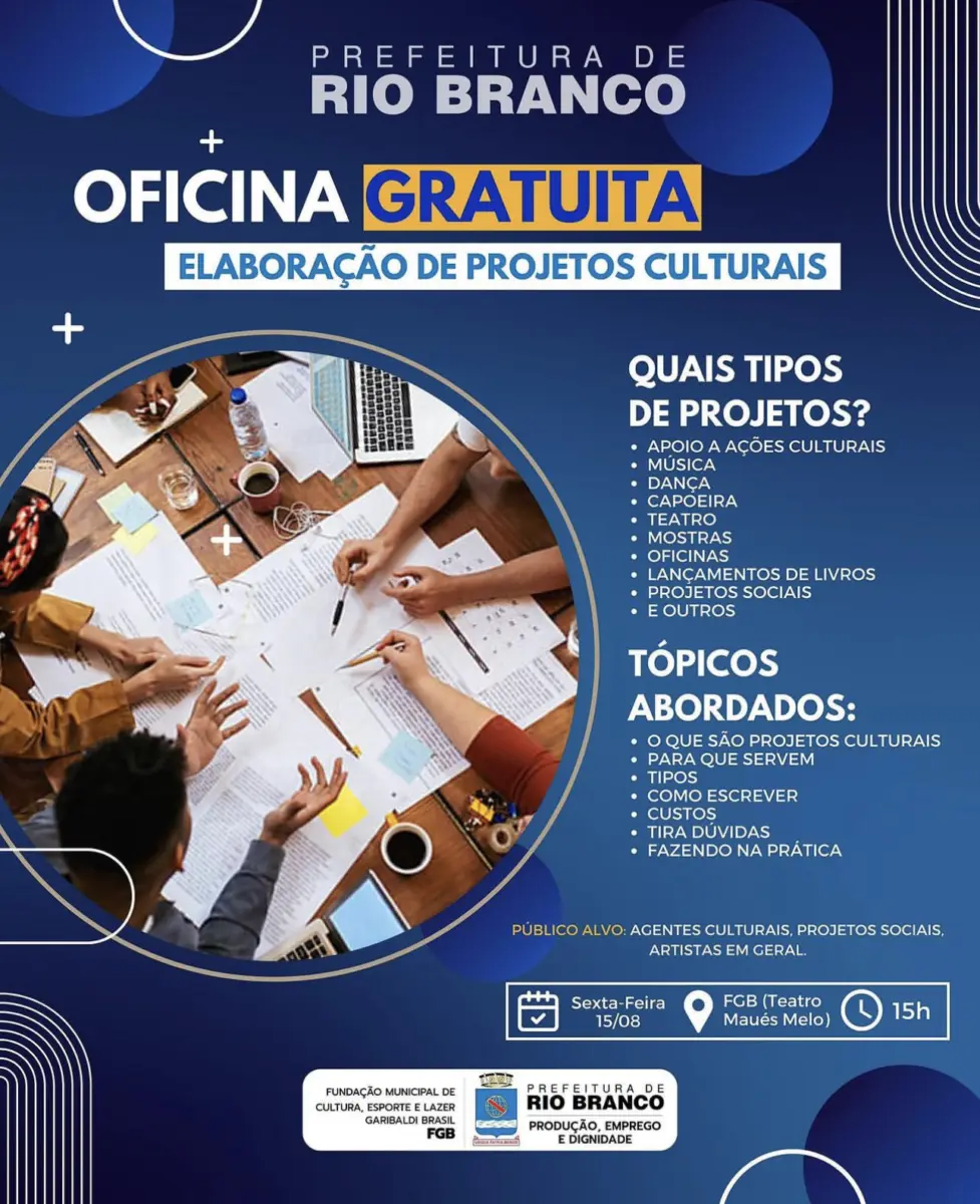 A Prefeitura de Rio Branco oferece uma oficina gratuita de elaboração de projetos culturais nesta sexta-feira (15), às 15h, no Teatro Maués Melo.