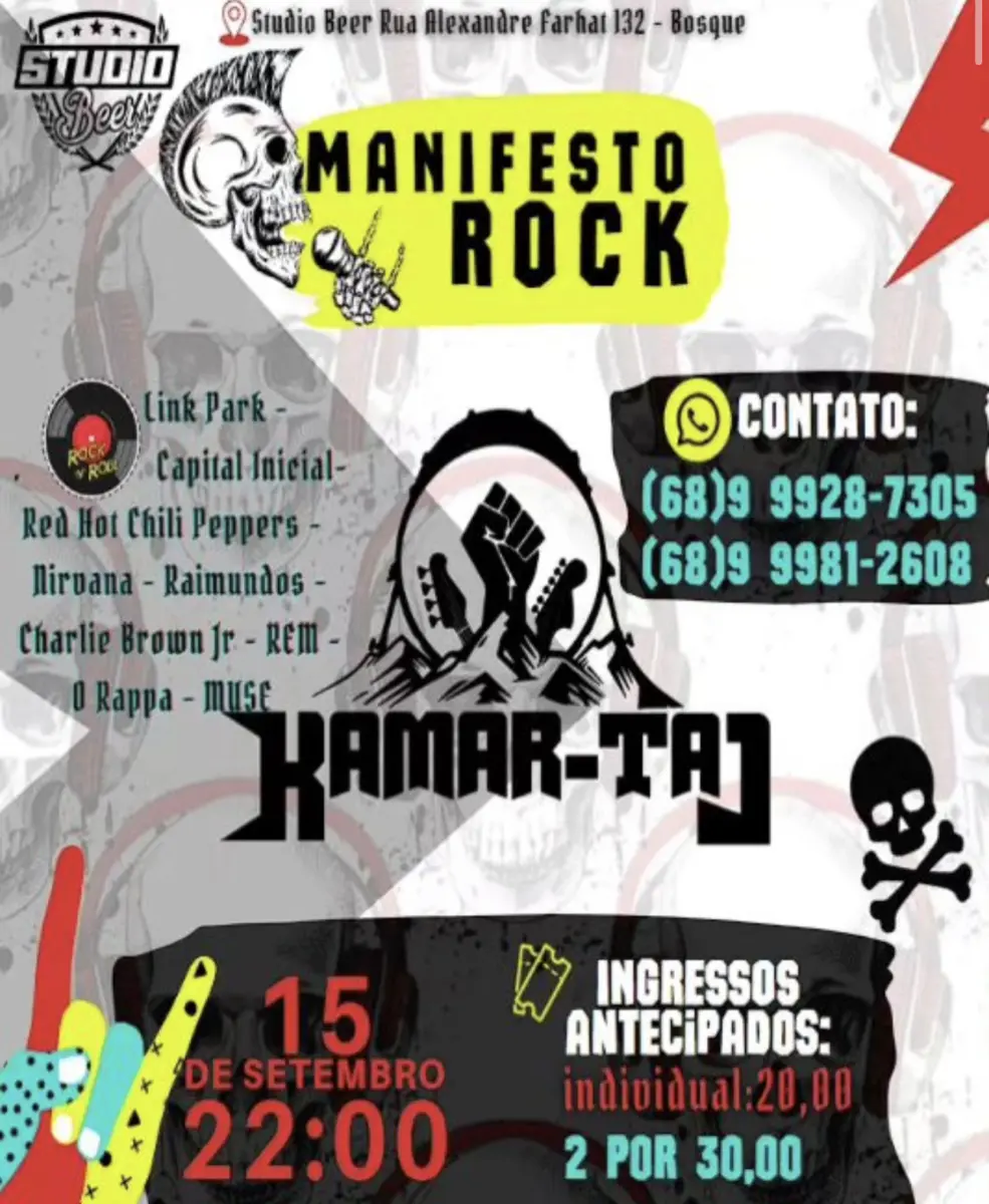 O Manifesto Rock, no Studio Beer, acontece nesta sexta-feira (15). Os ingressos antecipados custam R$ 20,00 e 2 ingressos estão pelo valor de R$ 30,00. A Banda Kamar-Taj é quem comanda o evento, que tem início às 22h.