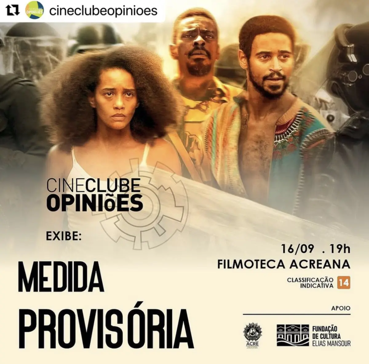O filme ‘Medida Provisória’, de Lázaro Ramos, fala sobre uma iniciativa de reparação pelo passado escravocrata, o governo brasileiro decreta uma medida provisória e provoca uma reação imediata no Congresso Nacional. Os parlamentares aprovam uma medida que obriga os cidadãos negros a se mudar para a África na intenção de retomar as suas origens. A aprovação afeta diretamente a vida do casal formado pela médica Capitú e pelo advogado Antonio, além de seu primo, o jornalista André, que mora com eles no mesmo apartamento. O filme conta com a atriz Taís Araújo, Seu Jorge e Alfred Enoch, conhecido pelo personagem Dino Thomas, em Harry Potter. Na Filmoteca Acreana, o filme está em cartaz neste sábado (16), às 19h.