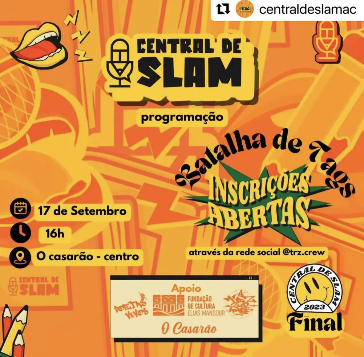 No próximo domingo, dia 17 de setembro, acontecerá a edição final do maior campeonato de poesia falada do Acre, conhecido como Slam. O evento será realizado das 15h às 22h no espaço Casarão, localizado no Centro de Rio Branco, e é organizado pela Central de Slam Acre.