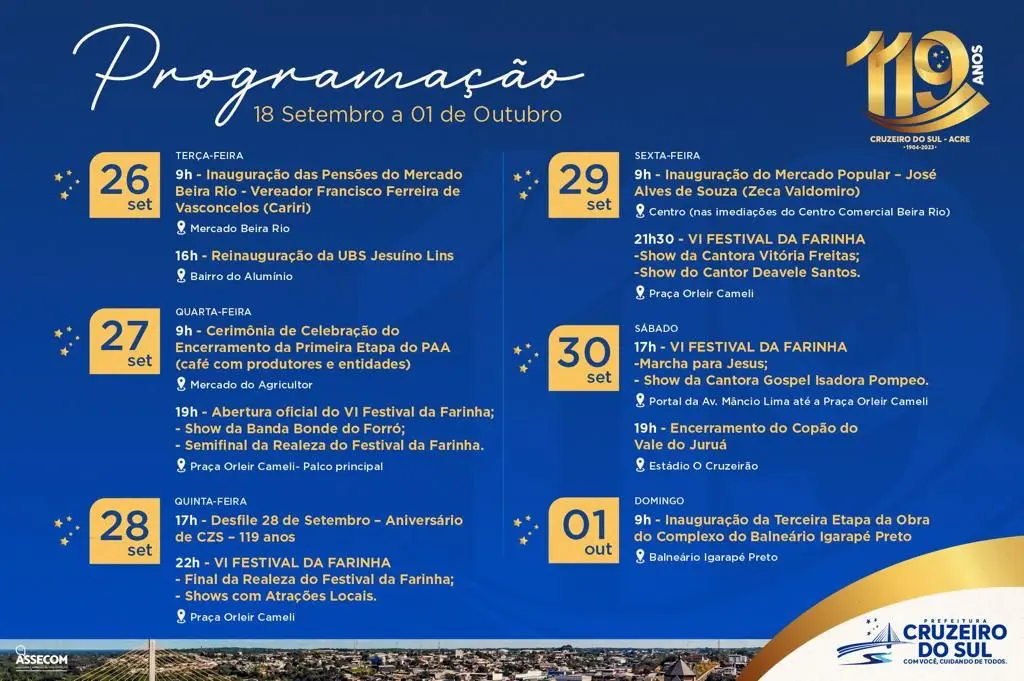 Fique ligado em nossas redes sociais para mais informações e atualizações sobre o 6º Festival da Farinha em Cruzeiro do Sul.