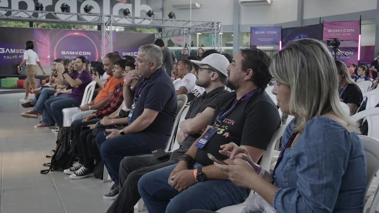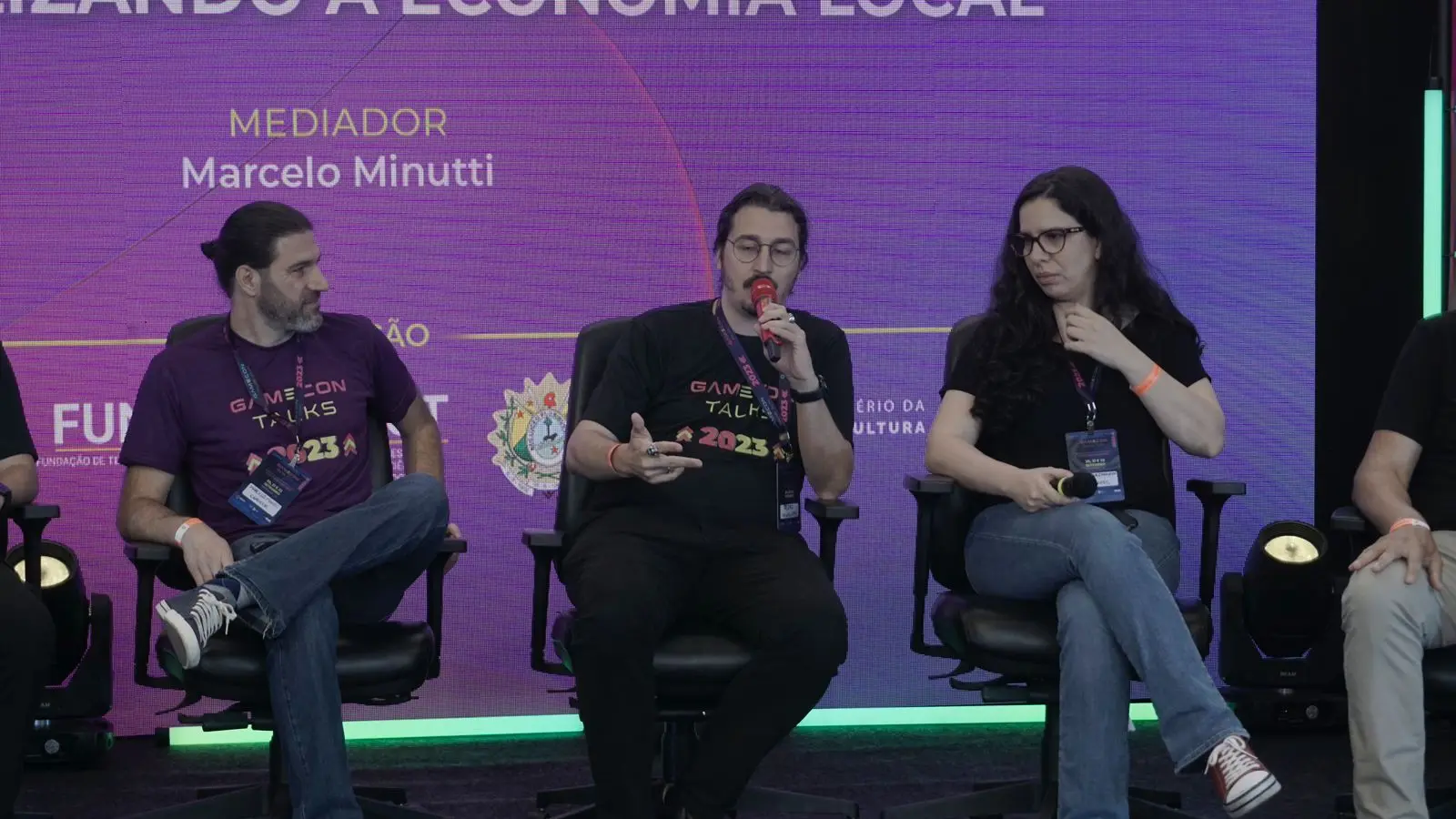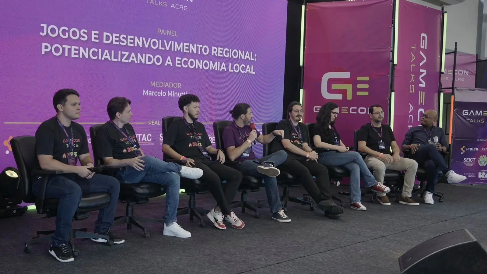 Já às 10h, aconteceu o painel “Jogos e desenvolvimento regional – potencializando a economia local”, com Pedro Zambon, diretor da Savegame.dev, João Bittar, político e entusiasta do mercado de inovação, Carolina Caravana, vice-presidente da Abragames, Philipp Bomm, especialista em produção técnica de eventos de games e eSports, Vinicius Ribeiro, da Aquiri Valley, Henrique Álefy Xavier, da Liga Acreana de e-Sports e fundador da Federação Acreana de Games e Tecnologia (FAGT), Dario Pavic, do Núcleo de Invoção Tecnológica- NIT – UFAC e Cristovão Henrique, do Strategic Director (DRX) no GeoLAB.