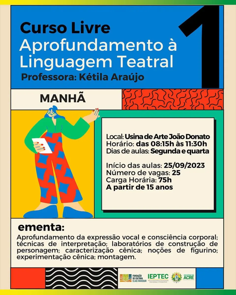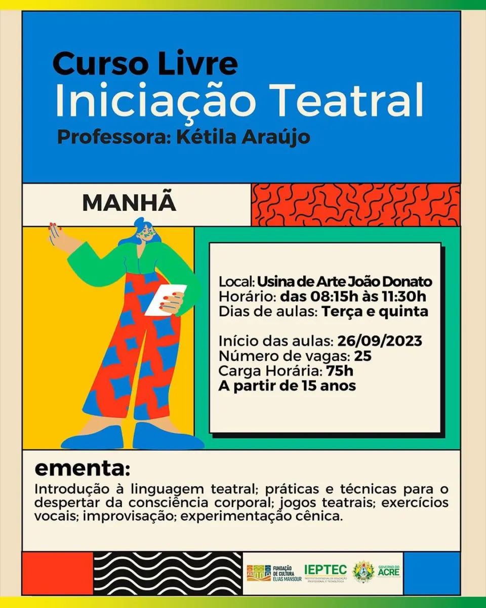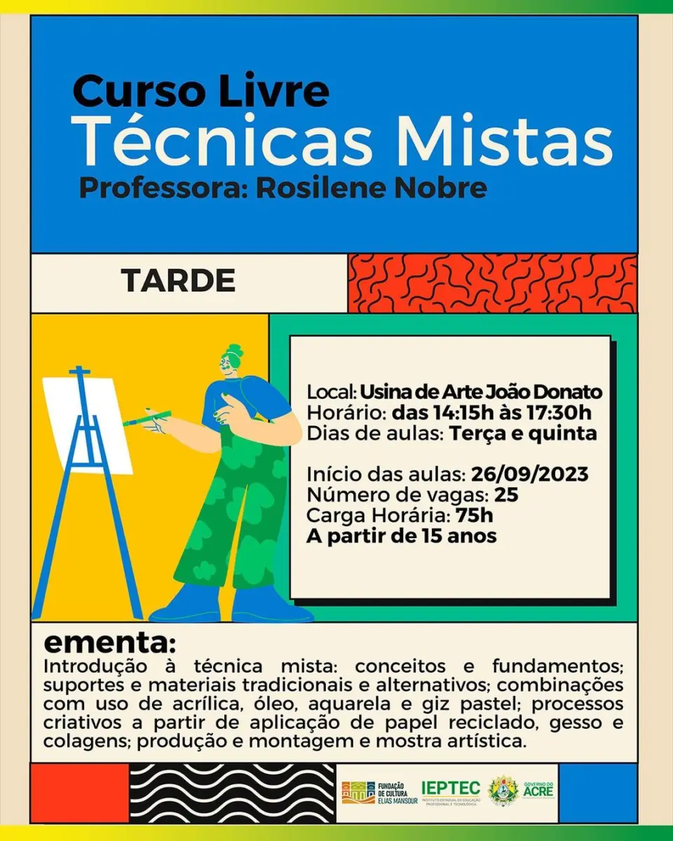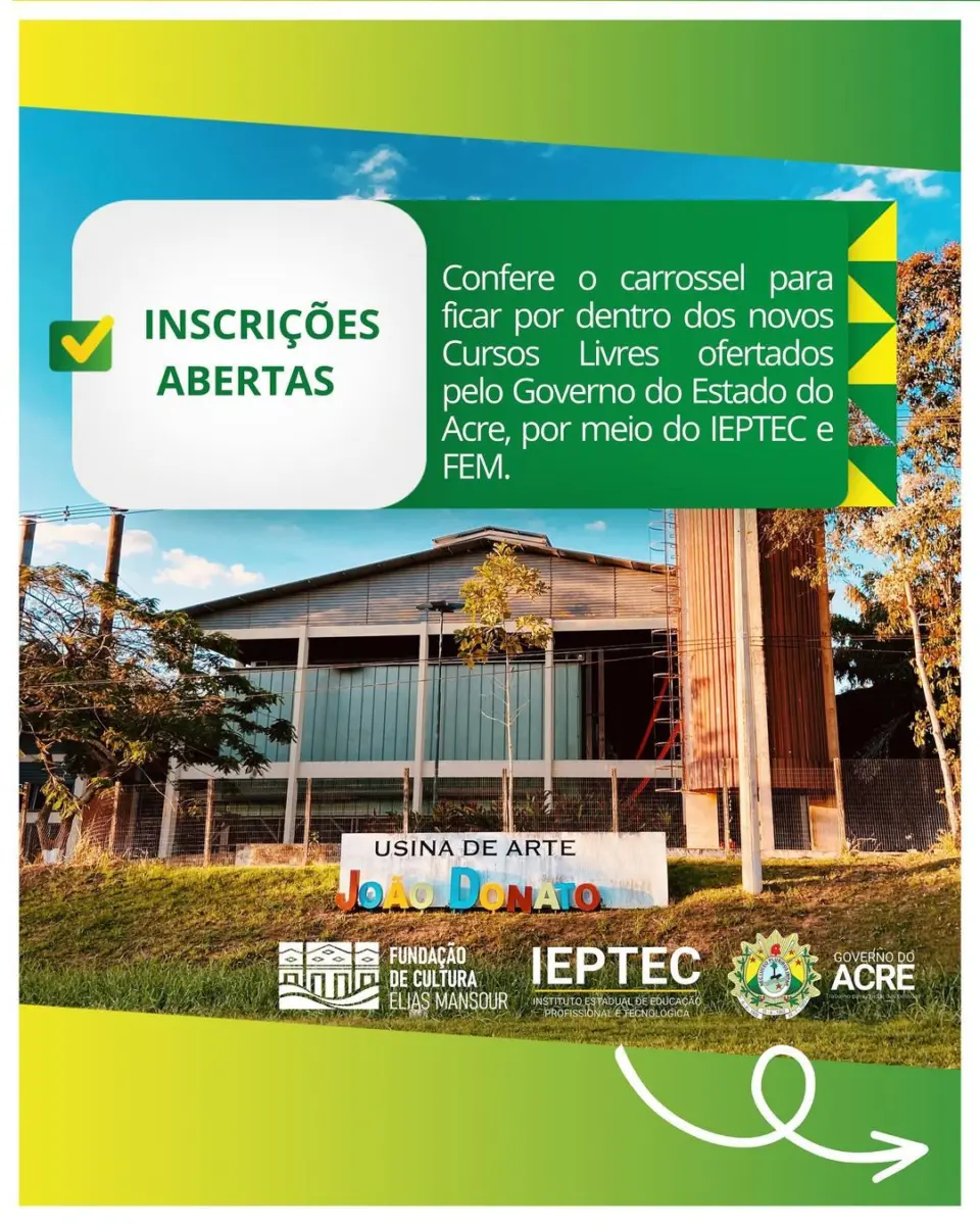 O Instituto Estadual de Educação Profissional e Tecnológica (IEPTEC) e a Fundação de Cultura Elias Mansour, em parceria com o governo do Estado do Acre, estão oferecendo uma oportunidade imperdível para os amantes das artes e interessados em aprimorar suas habilidades na área. São 125 vagas gratuitas disponíveis para cursos livres na renomada Usina de Arte.