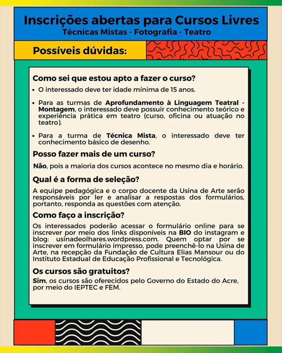 Essa é uma oportunidade única para a comunidade adquirir conhecimentos e se aprofundar no mundo das artes de forma acessível e gratuita. Não perca a chance de participar desses cursos enriquecedores e contribuir para o desenvolvimento cultural do Estado do Acre.