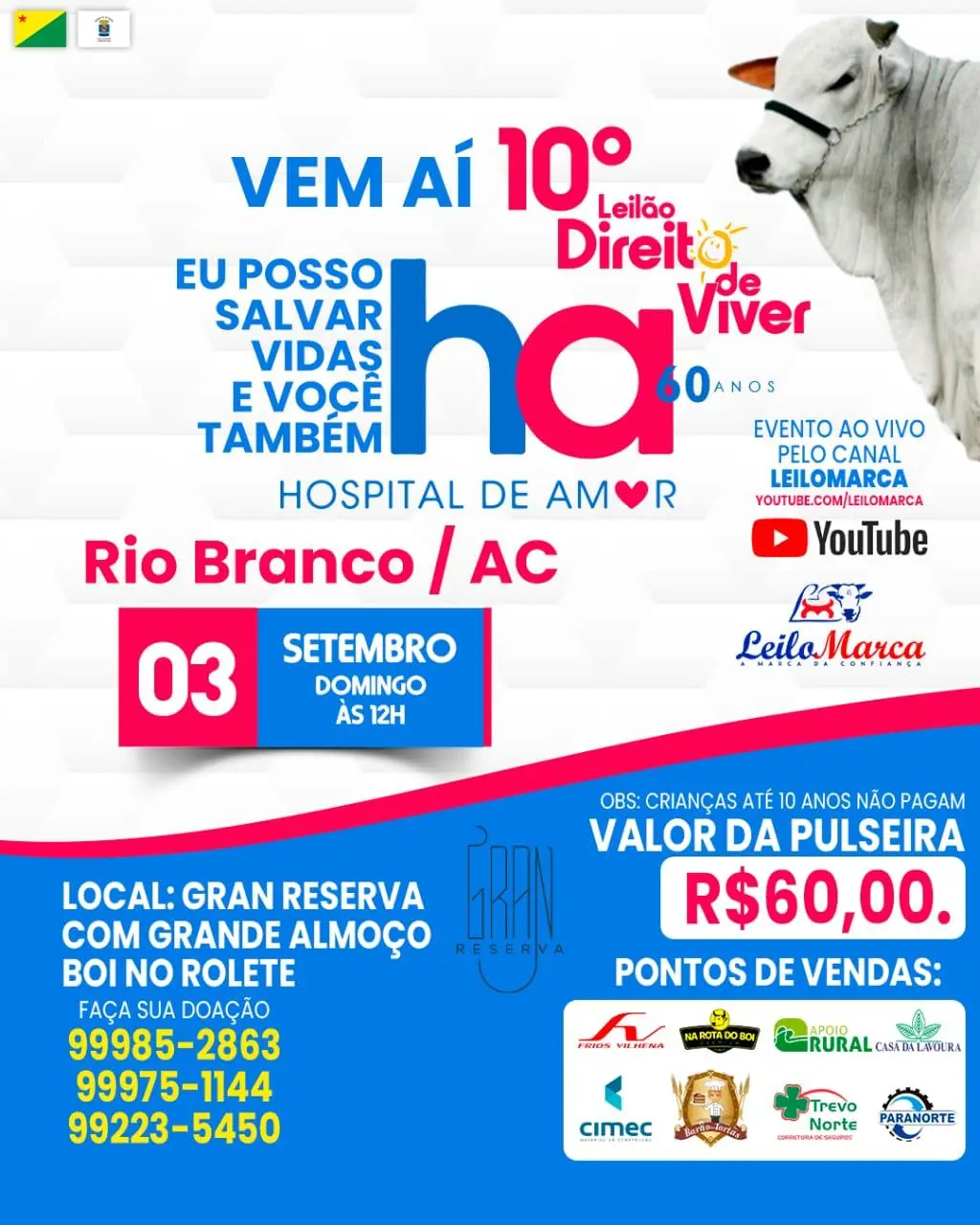 O Hospital de Amor em Rio Branco realiza no próximo domingo (3), a 10ª edição do Leilão Direito de Viver. A unidade faz parte da maior instituição da América Latina na atuação no tratamento contra câncer, o Hospitel de Amor, antigo Hospital de Câncer de Barretos (SP), que realiza atendimento gratuito da doença.