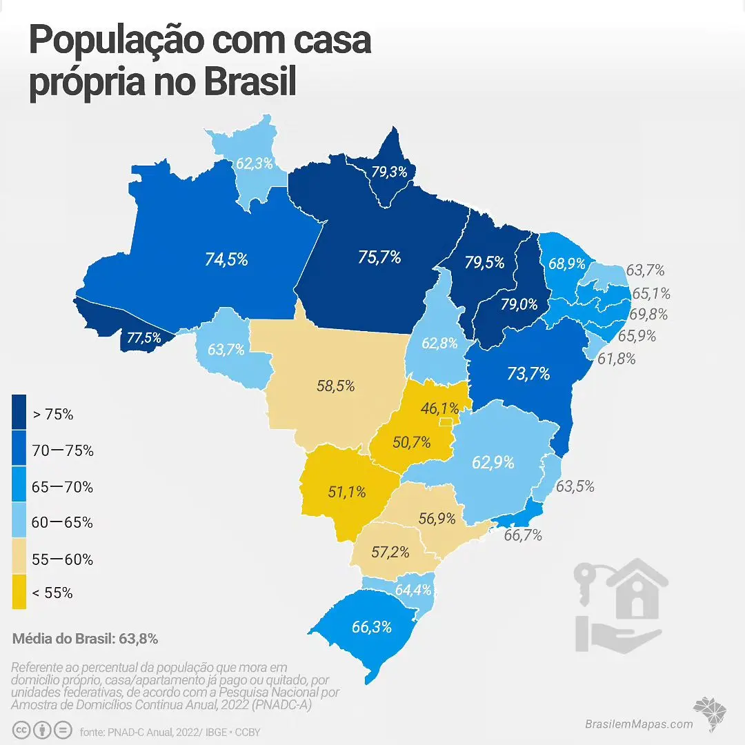 Segundo os dados, o Brasil possui 63,8% da população proprietária e residente de imóveis próprios já pagos