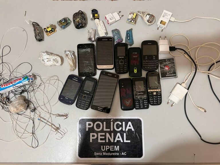 A fiscalização atenta dos policiais penais evitou a entrada de mais uma remessa de celulares no presídio Evaristo de Moraes, em Sena Madureira. Infratores que estão do lado de fora, utilizaram a mesma tática para tentar enganar os policiais. Eles lançaram os aparelhos por cima da muralha.