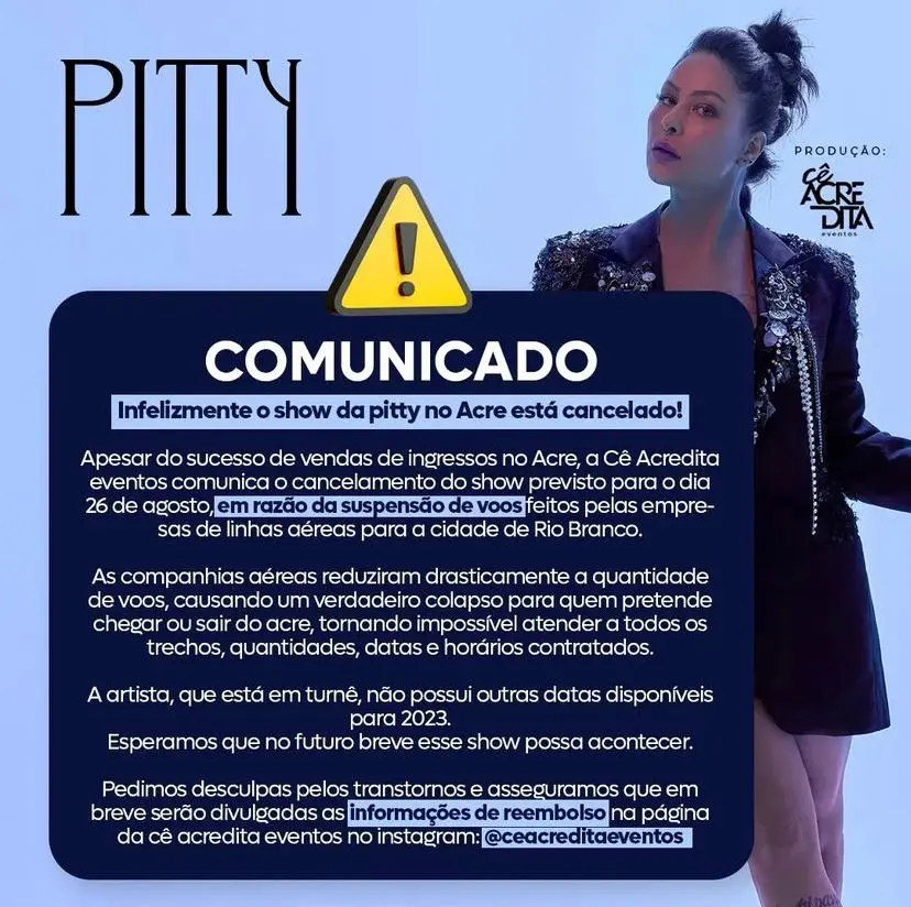 O show da cantora Pitty estava marcado para acontecer no mês passado em Rio Branco. Por dificuldades no sistema aeroviário do Acre, a apresentação da artista precisou ser cancelada.