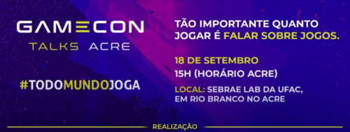 Uma iniciativa da Plataforma Gamecon DIA 18 de Setembro – das 14:30h às 17:30h – Local: SEBRAE LAB da UFAC, em Rio Branco no Acre Queremos saber quem é você no mundo gamer. Quais desafios você encontra e juntos vamos vislumbrar soluções para o desenvolvimento do mercado de games no estado do Acre. Participe!