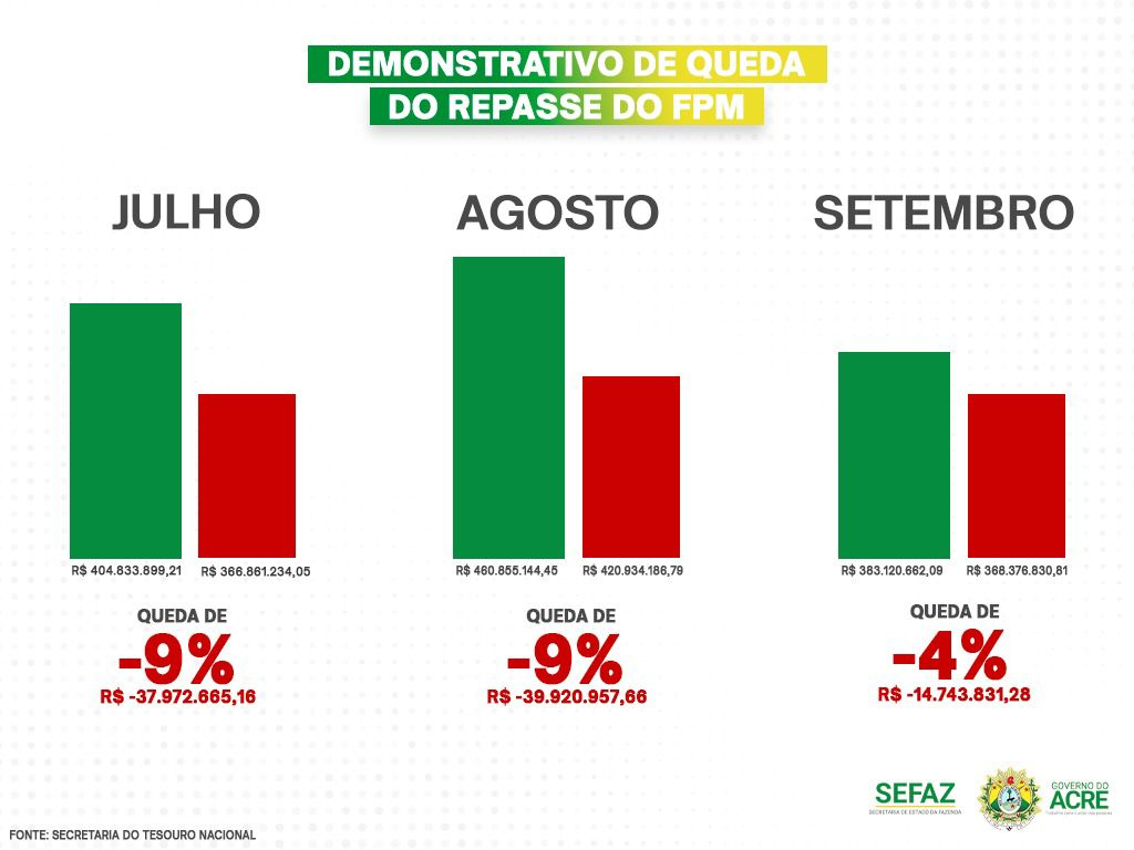 O estado do Acre em julho deste ano registrou um déficit de mais de R$ 37 milhões no repasse, em comparação ao mesmo mês, em 2022. Já em agosto, a queda foi de R$ 40 milhões a menos com relação ao ano anterior.