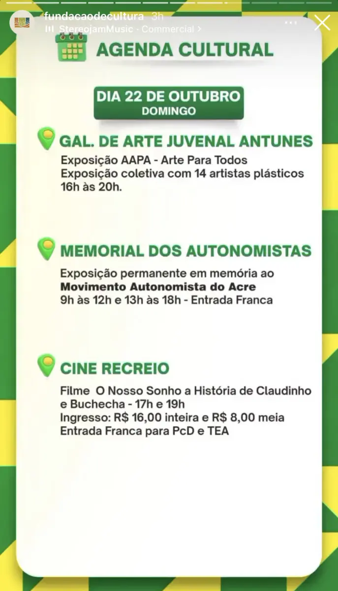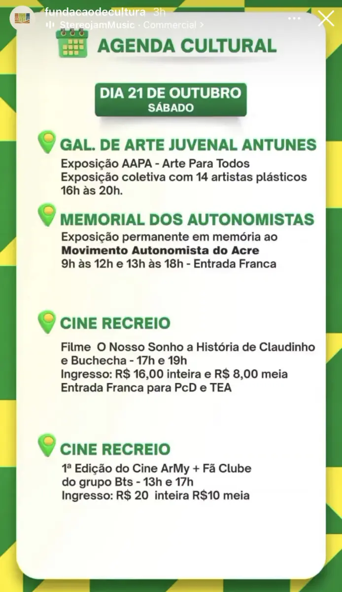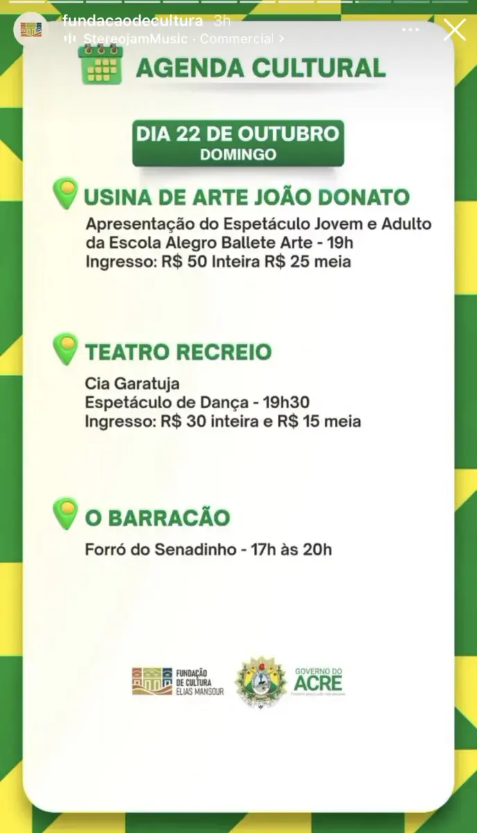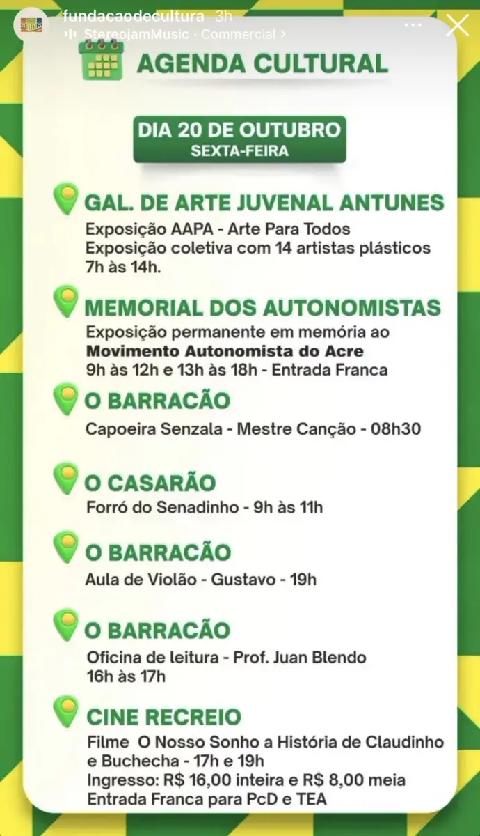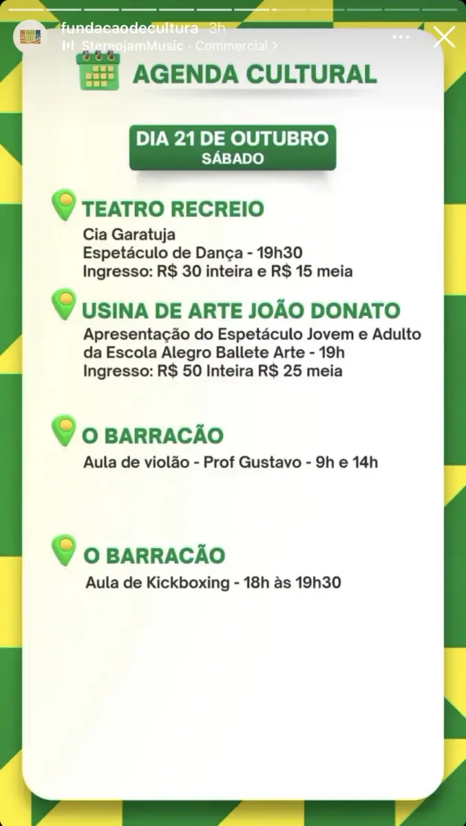 De sexta a domingo, a Fundação Cultura Elias Mansour oferece um rico conjunto de atividades para proporcionar entretenimento e aprendizado. Os visitantes podem desfrutar de apresentações de dança cativantes, participar de oficinas de leitura que estimulam a imaginação, aprender a tocar violão em aulas práticas, explorar exposições de arte inspiradoras, assistir a filmes envolventes e até mesmo se exercitar com aulas de Kickboxing emocionantes. É um fim de semana repleto de cultura, arte e diversão para todas as idades.