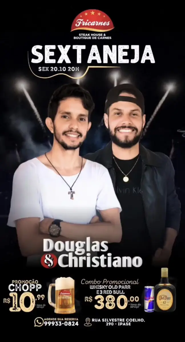 Prepare-se para uma noite repleta de música sertaneja na Fricarnes Steak House & Boutique de Carnes, pois a dupla sertaneja Douglas e Christiano está pronta para encantar os amantes desse gênero musical. Com suas vozes marcantes e repertório envolvente, eles prometem tornar a noite memorável.
