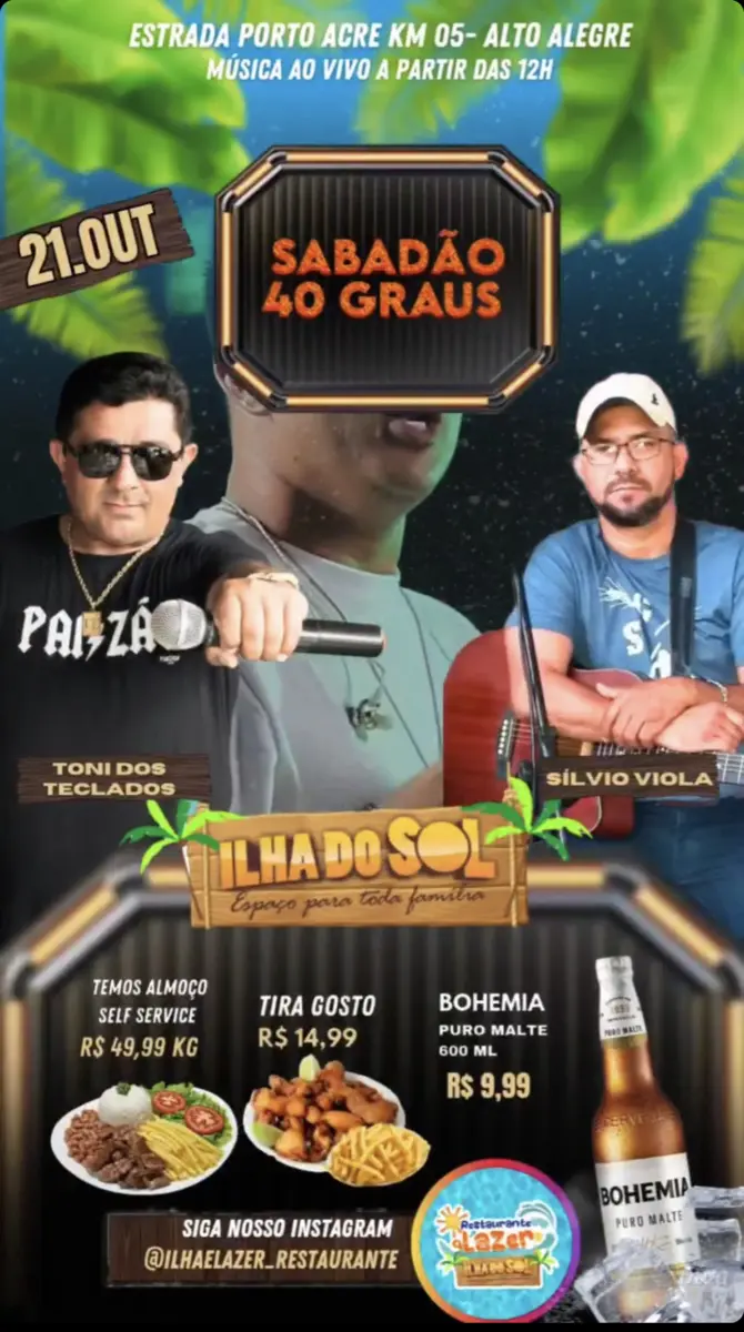 Prepare-se para um “Sabadão 40 Graus” de pura animação no Balneário Ilha do Sol! Neste evento especial, você terá a oportunidade de curtir o talento musical de Toni dos Teclados e Silvio Viola, dois artistas que prometem aquecer ainda mais o clima.