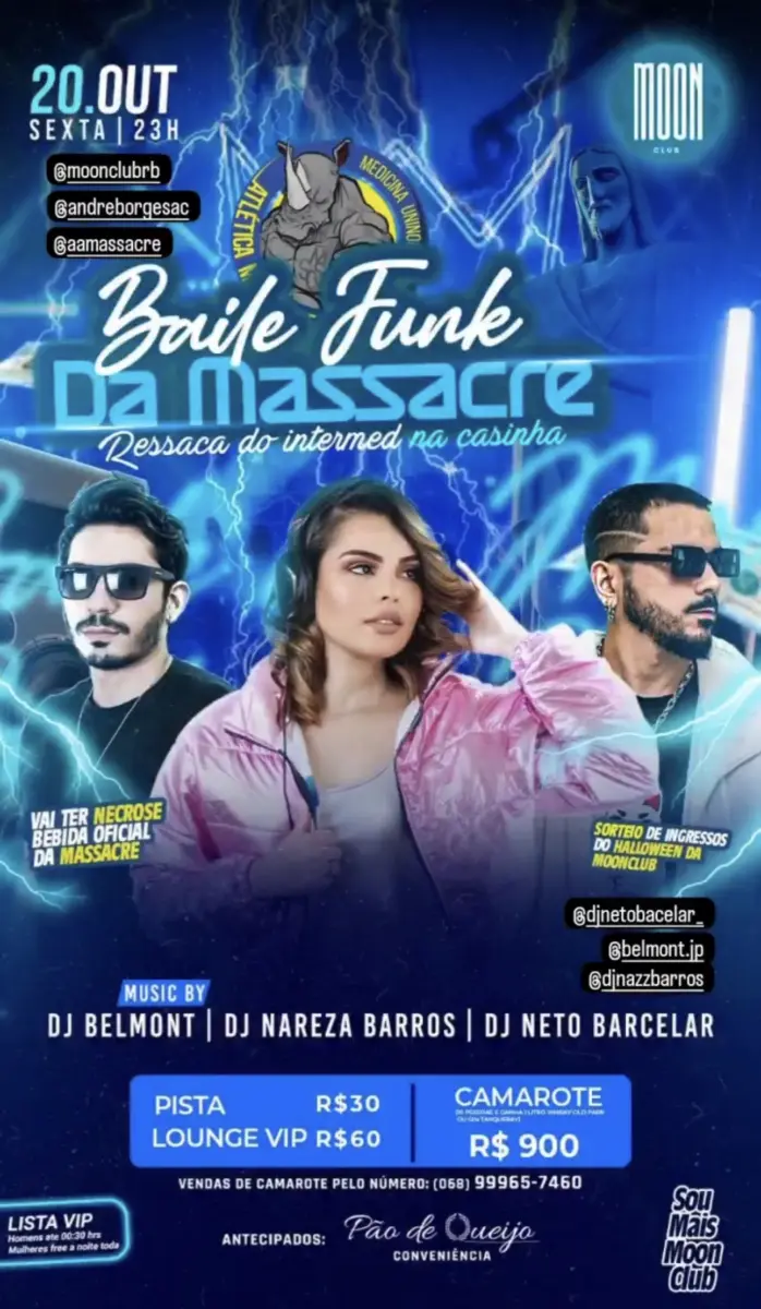 Para os amantes do funk, a Moon Club apresenta o aguardado “Baile Funk da Massacre”, sob o comando dos talentosos DJs Belmont, Nareza Barros e Neto Barcelar. A pista promete tremer ao som contagiante deste gênero musical.