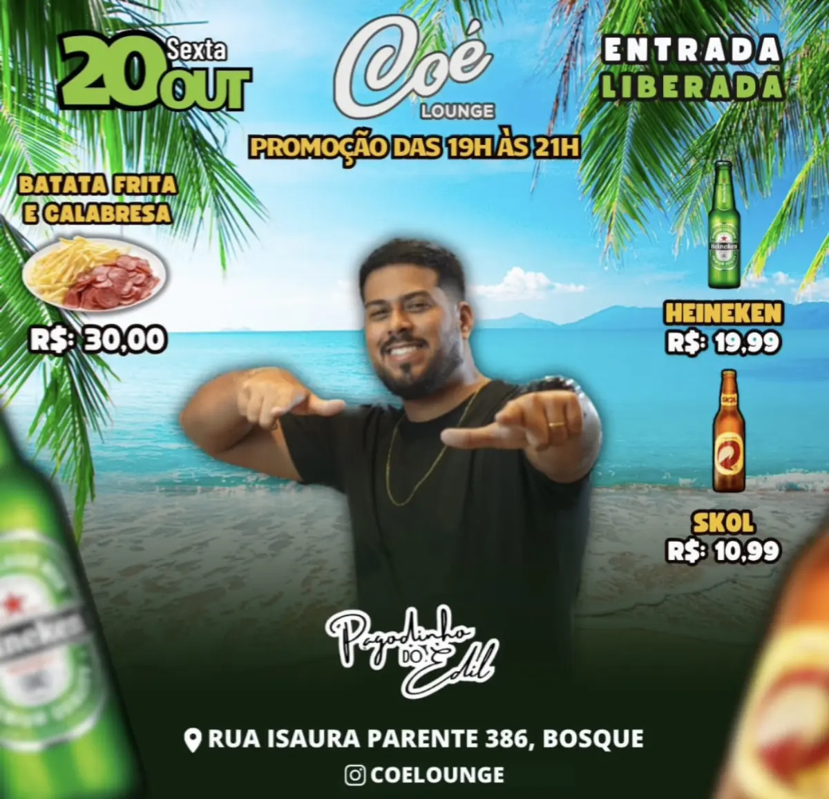O Coé Lounge tem o prazer de apresentar uma noite especial de pagode com o talentoso Edil. Prepare-se para uma atmosfera descontraída e cheia de samba no pé, onde o “Pagodinho do Edil” vai encantar os presentes com sua voz e seu repertório cativante.