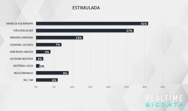 O ex-prefeito da capital, Marcus Alexandre, lidera a pesquisa estimulada com 31% dos votos. Logo atrás, vem o atual prefeito Tião Bocalom, com 27%, que cresceu significativamente em comparação com outras pesquisas.