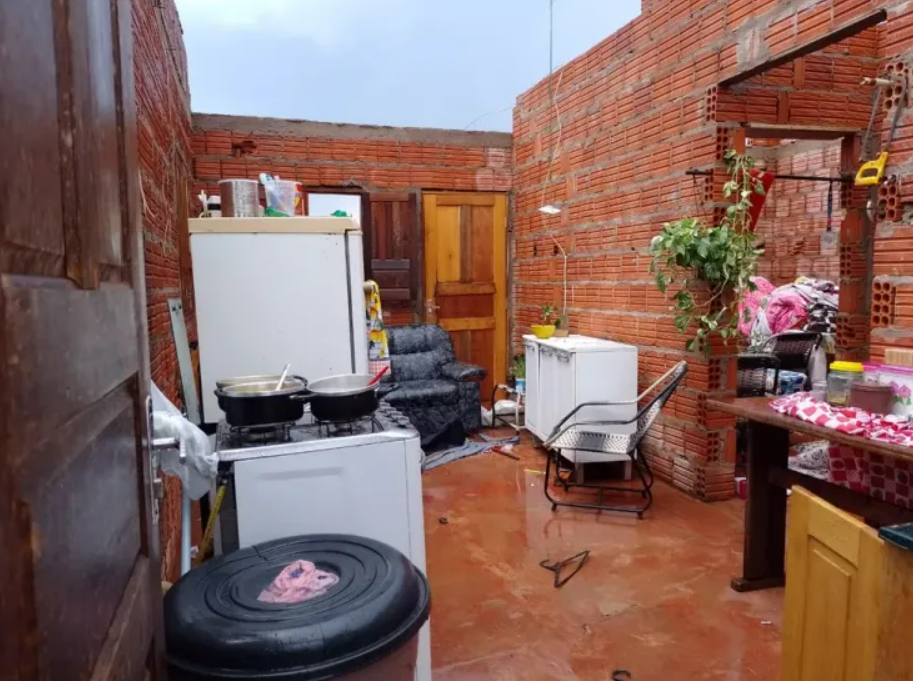 Com a forte chuva e ventos que levaram seu telhado, todos os seus móveis ficaram danificados, alguns destruídos. Ela e os filhos escaparam da chuva embaixo de uma mesa.