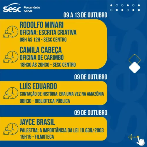Nesse mesmo período, horário e local, o músico Rodolfo Minari ministrará uma oficina de Escrita Criativa. No dia 9, às 8h30, na Biblioteca Pública, Luís Eduardo comandará a Contação de História: Era uma Vez na Amazônia. E às 15h15, na Filmoteca, Jayce Brasil profere a palestra “A importância da Lei 10.639/2003”.