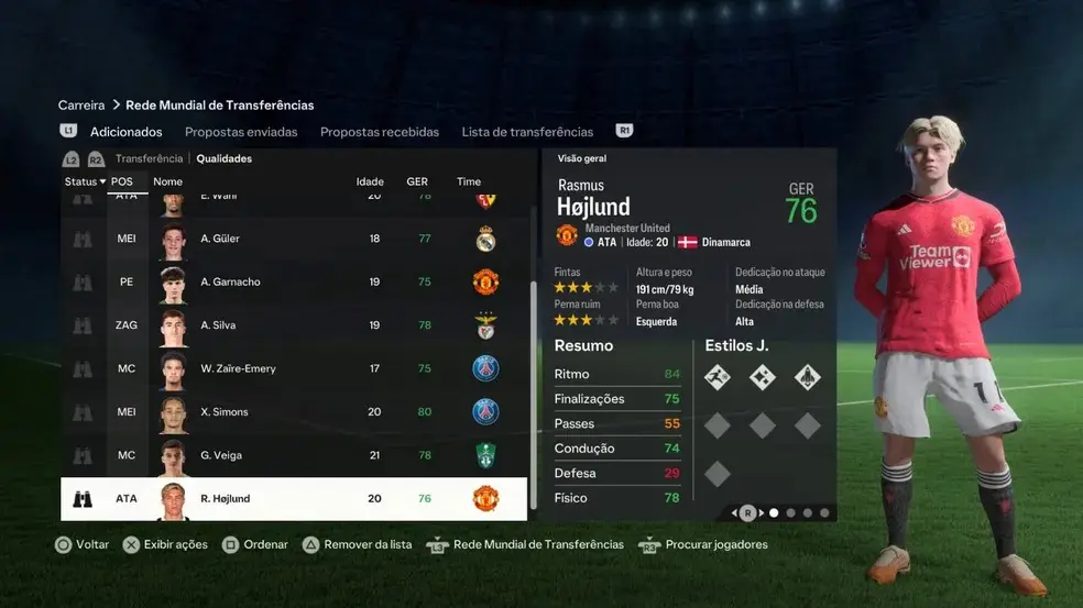 Recém contratado pelo Manchester United por 72 milhões de libras, o jovem centroavante dinamarquês marcou 10 gols em 34 jogos pela Atalanta na temporada passada, chamando a atenção do clube inglês. Hojlund tem 20 anos, 76 de overall e 89 de potencial. Para poder contratá-lo na primeira temporada é necessário definir como flexível a rigidez na negociação.