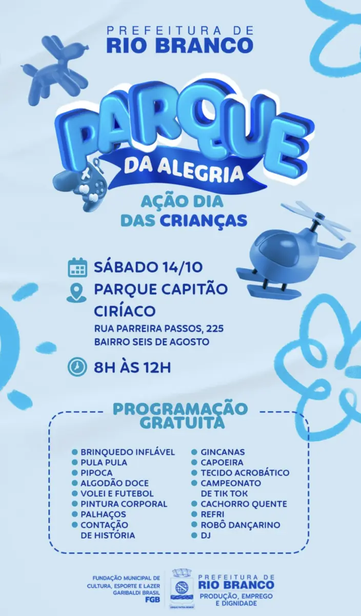 -A Prefeitura de Rio Branco está organizando um evento especial no Parque da Alegria, no Capitão Ciríaco, para comemorar o Dia das Crianças no próximo sábado, dia 14. Será uma manhã repleta de diversão, risos e aventuras em meio à natureza. Não deixe de participar e fazer desse dia uma lembrança inesquecível para os pequenos!