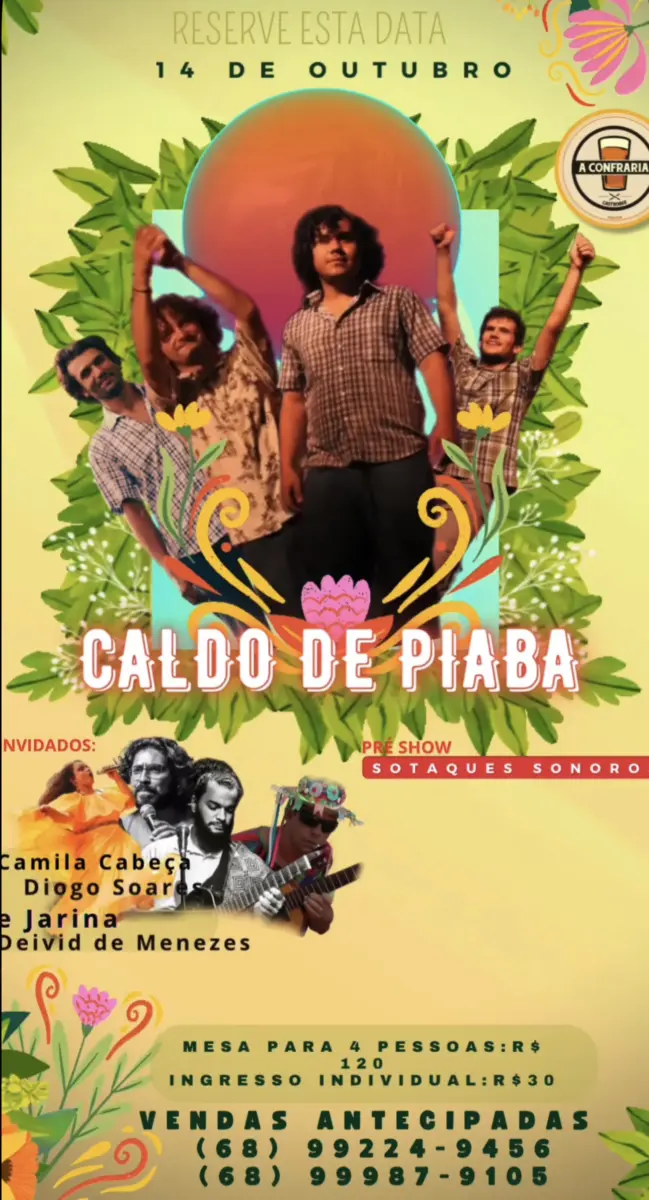 -Neste sábado (14), a banda Caldo de Piaba sobe ao palco para celebrar seus 15 anos. A banda prepara um grande show com a participação especial de outros músicos. Vendas pelo WhatsApp (68) 99924 9456.