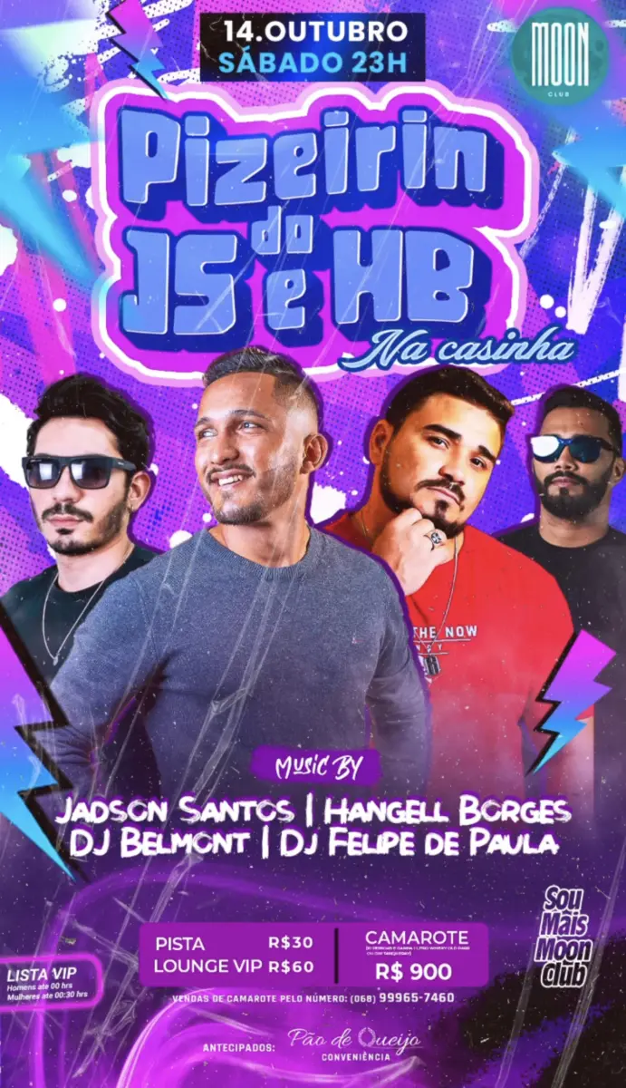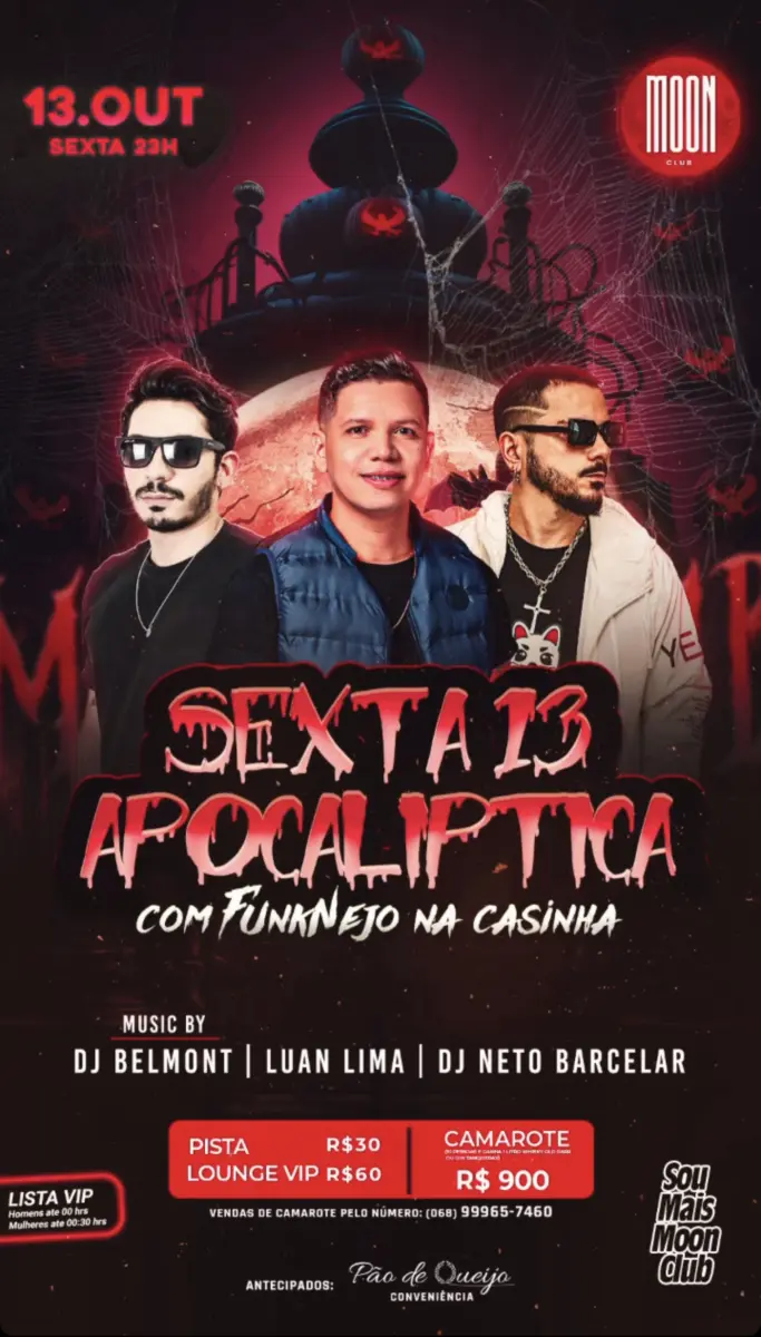 -A Sexta 13 Apocalíptica da Moon Club é uma experiência musical única, onde o FunkNejo, uma incrível fusão de Funk com Sertanejo, embala a noite até o amanhecer. No sábado, Pizeirin do Jadson Santos e Hangell Borges comandam a “casinha” com o melhor do sertanejo universitário e do funk, garantindo agitação total na Moon Club. Não perca essa festa!