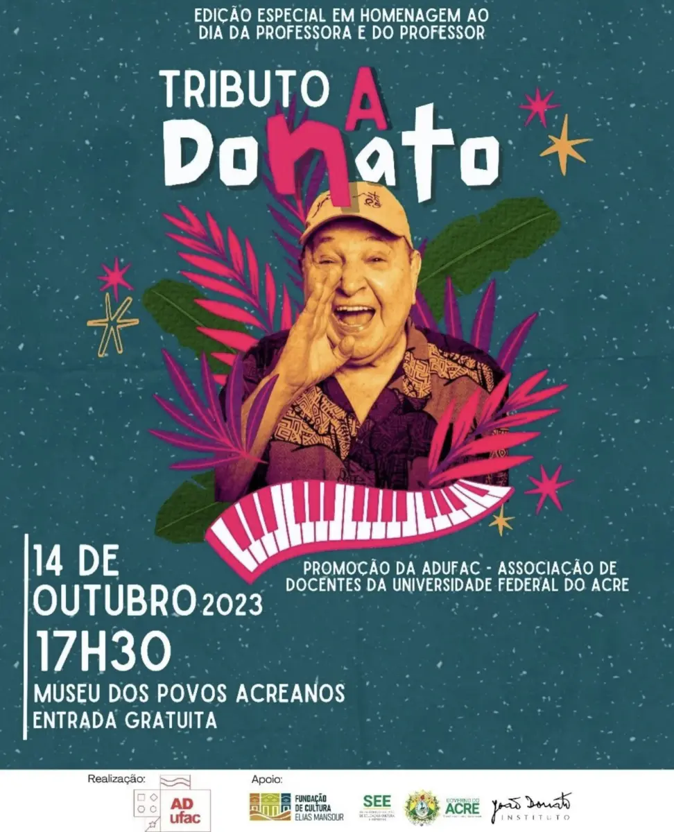 – Em comemoração ao Dia da Professora e do Professor, a Associação de Docentes da Ufac (ADufac) preparou uma programação especial em Rio Branco. No próximo sábado, 14, às 17h30, no Museu Povos Acreanos (MPA), haverá a reedição do show “Tributo a João Donato,” com a participação de 30 artistas locais interpretando as canções icônicas do cantor e compositor acreano. O evento é gratuito e aberto a toda a sociedade, acontecendo na Praça Meandros do MPA.