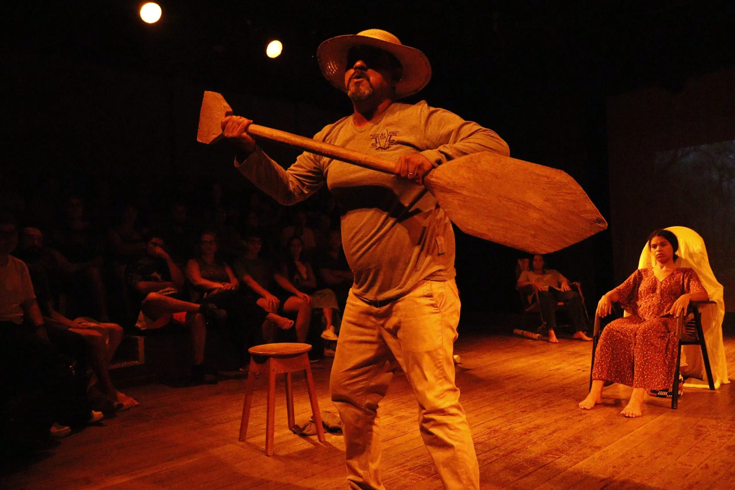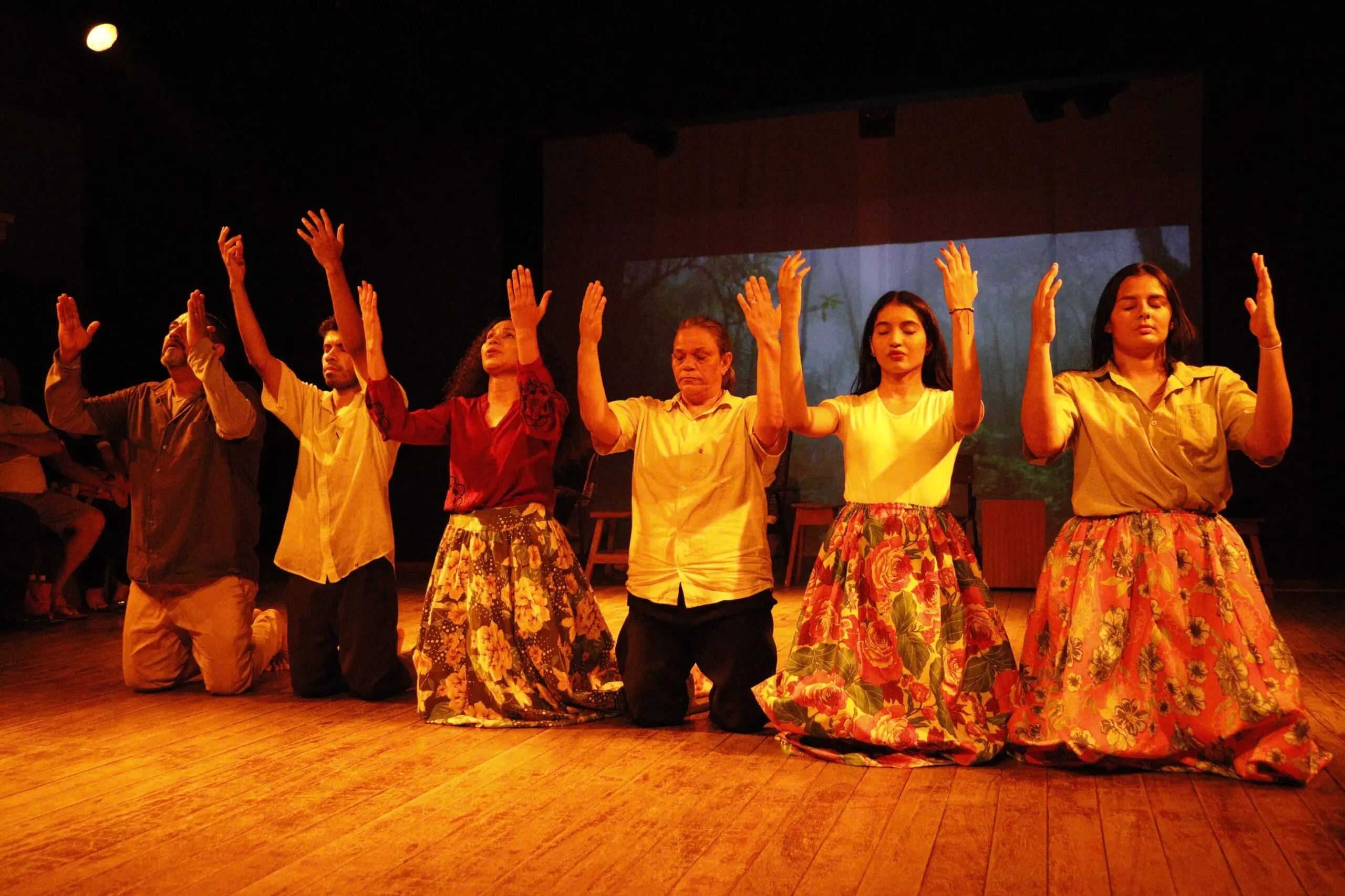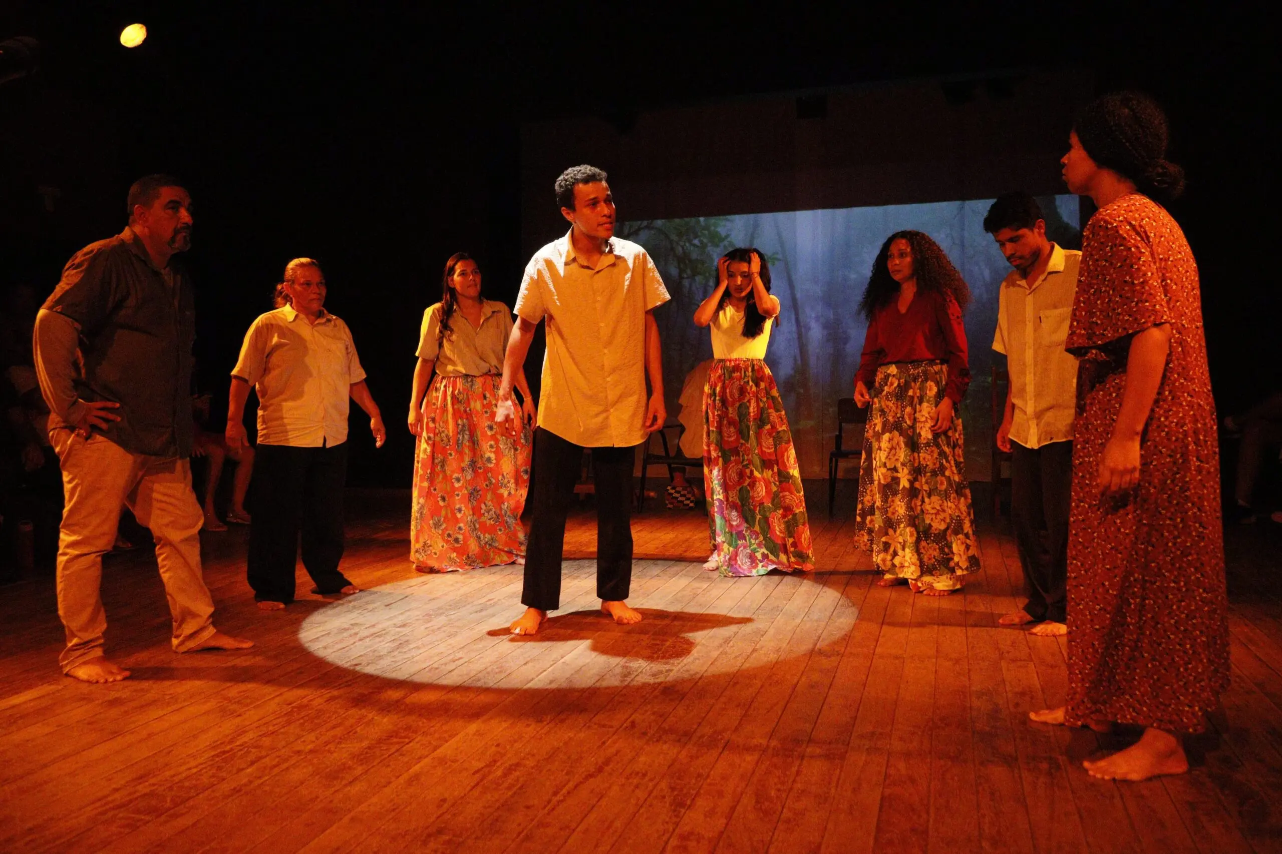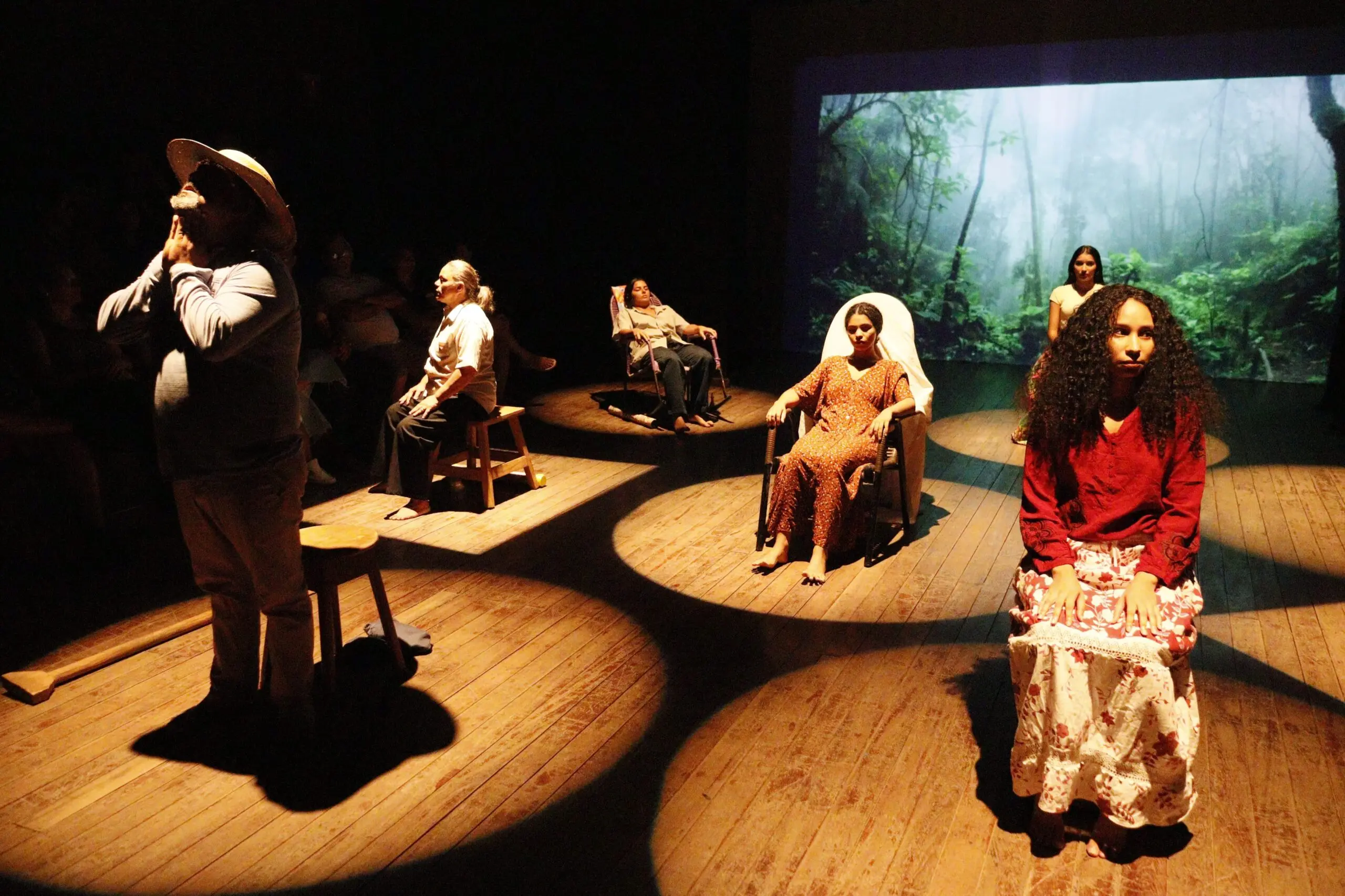 “Lá no seringal…” é a expressão máxima que rememora um passado comum a todo acreano. As pessoas que usam essa expressão são avós, pais, mães, tias, que foram seringueiros ou viveram em moradias simples, feitas de paxiúba, no coração da floresta amazônica. No presente, estas histórias são contadas para as gerações mais novas e são a matéria prima do espetáculo “Vozes do Seringal”, do Coletivo Taboqueiro, apresentado na noite da última quarta-feira, 19, no Teatro de Arena do Sesc, em Rio Branco.