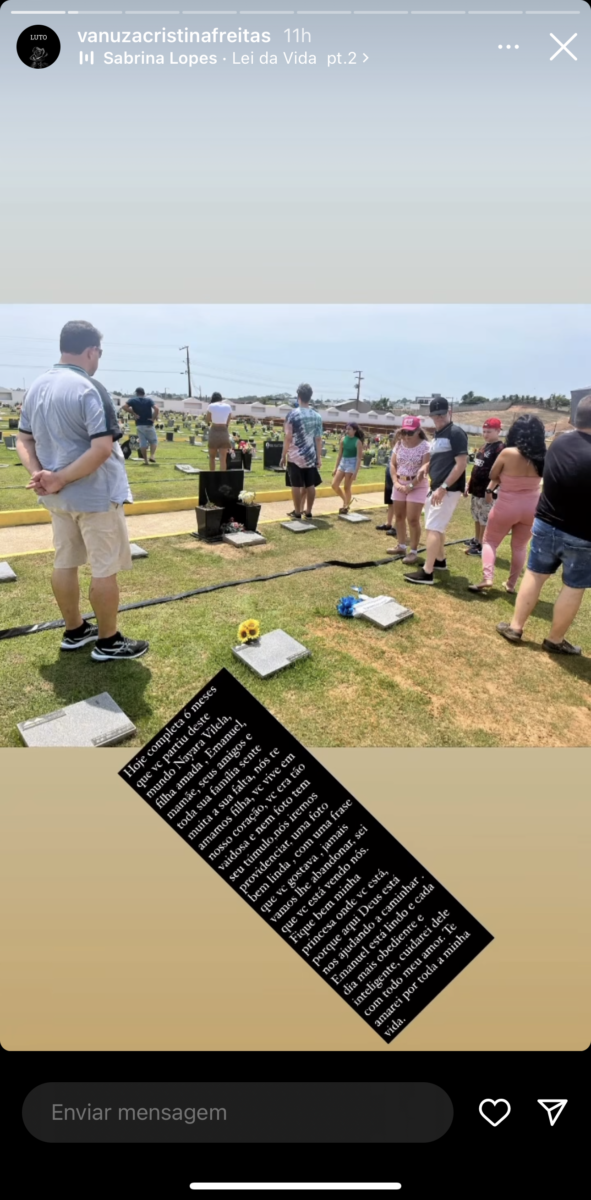 “Hoje completa 6 meses que você partiu deste mundo, Nayara Vilela, filha amada. Emanuel, mamãe, seus amigos e toda sua família sentimos muita a sua falta. Nós te amamos, filha. Você vive em nosso coração. Era tão vaidosa e nem foto tem no seu túmulo, mas nós iremos provideciar, uma foto bem linda, com uma frase que você gostava. Jamais vamos te abandonar. Sei que você está nos vendo”, escreveu.