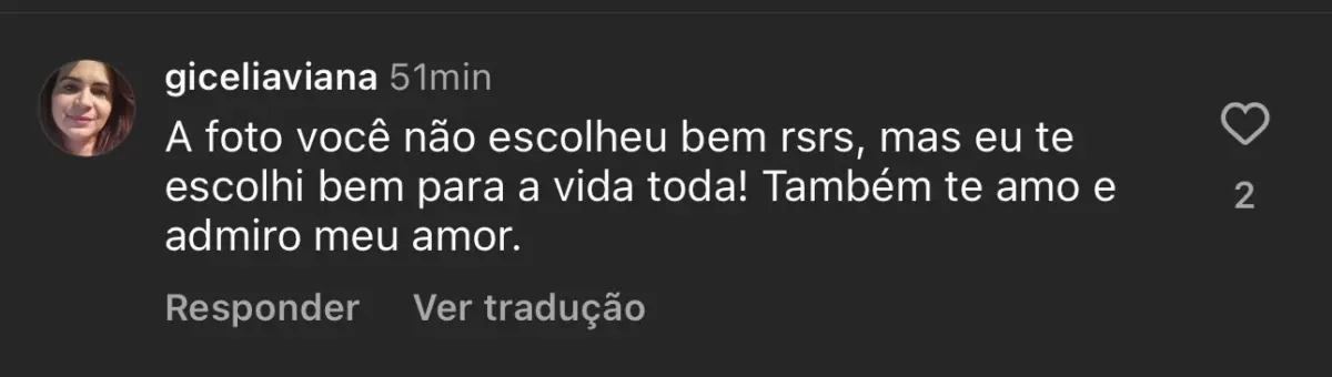 Gilcélia Viana respondeu a mensagem apaixonada do esposo com uma pitada de humor: “A foto você não escolheu bem rsrs, mas eu te escolhi bem para a vida toda! Também te amo e admiro meu amor.”