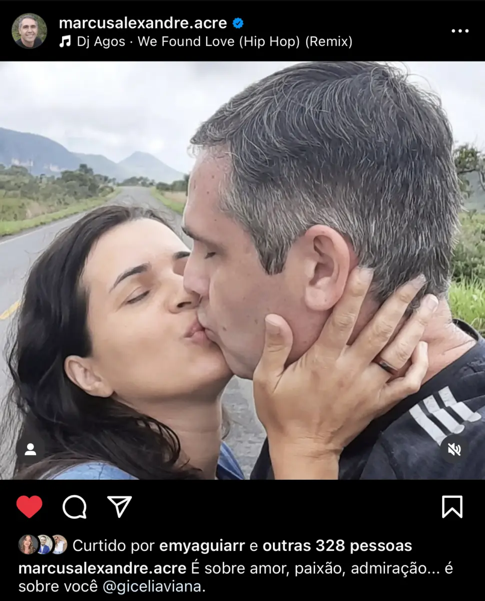 O ex-prefeito de Rio Branco e engenheiro civil, Marcus Alexandre fez uma declaração de amor para a esposa, a engenheira civil Gilcélia Viana Médici, nesta quarta-feira (25), no Instagram. O político acreano publicou uma foto aos beijos com a esposa, no Dia do Engenheiro e da Engenheira, e ganhou diversos elogios nas redes sociais. O clique ainda ganhou uma trilha sonora da cantora Rihanna “We Found Love”.